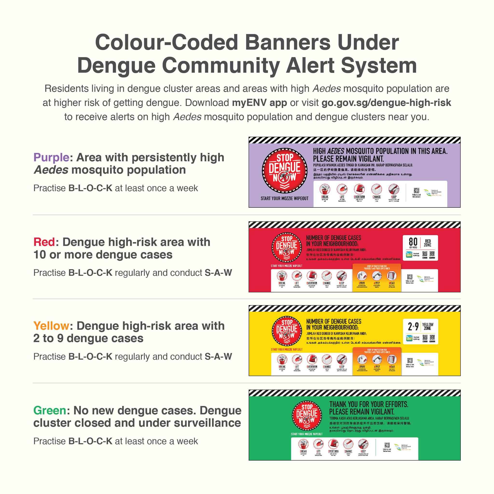 Green: No new dengue cases. Dengue cluster closed and under surveillance. Practise BLOCK at least once a week.
