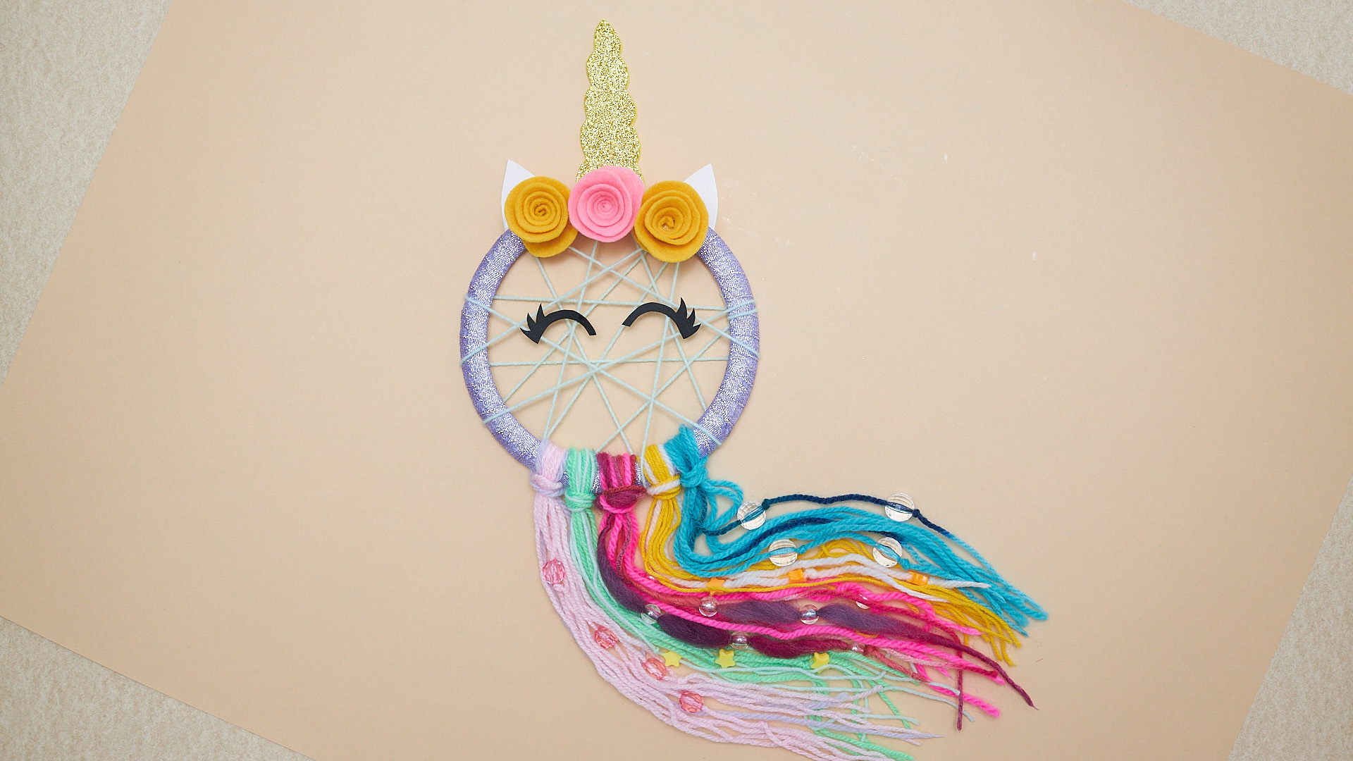 Tie two ends of a piece of yarn to the hoop and hang it up. Here’s to sweet dreams with heaps of rainbows and unicorn magic!