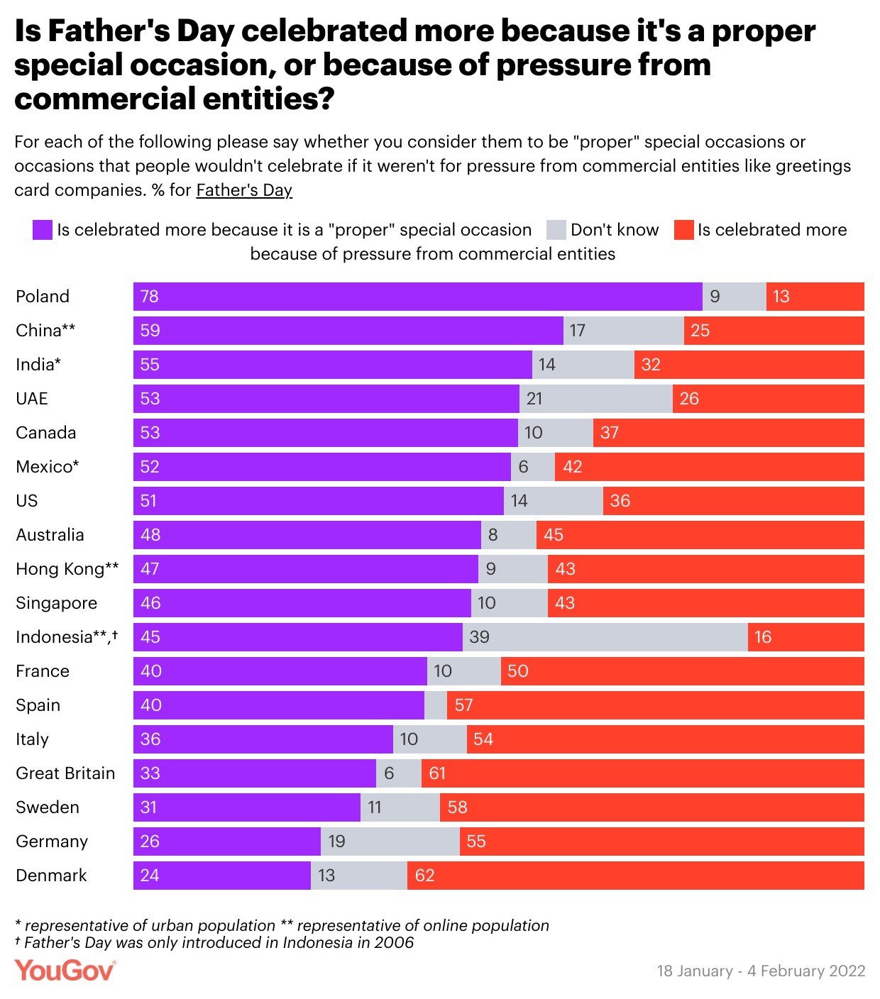 Out of over 19,000 respondents across 18 countries and territories, four in nine (45%) believe the day is celebrated as a "proper" special occasion. However, only slightly fewer respondents (43%) believe that Father's Day celebrations are a result of pressure from commercial entities.