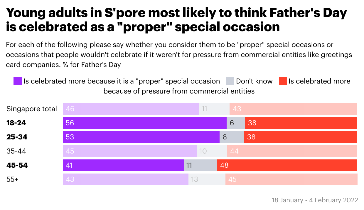 Among Singaporean respondents, belief that Father’s Day is still being celebrated as a "proper" special occasion is generally higher in younger adults, with more than half of those aged 18-24 (56%) and 25-34 (53%) agreeing with this sentiment.