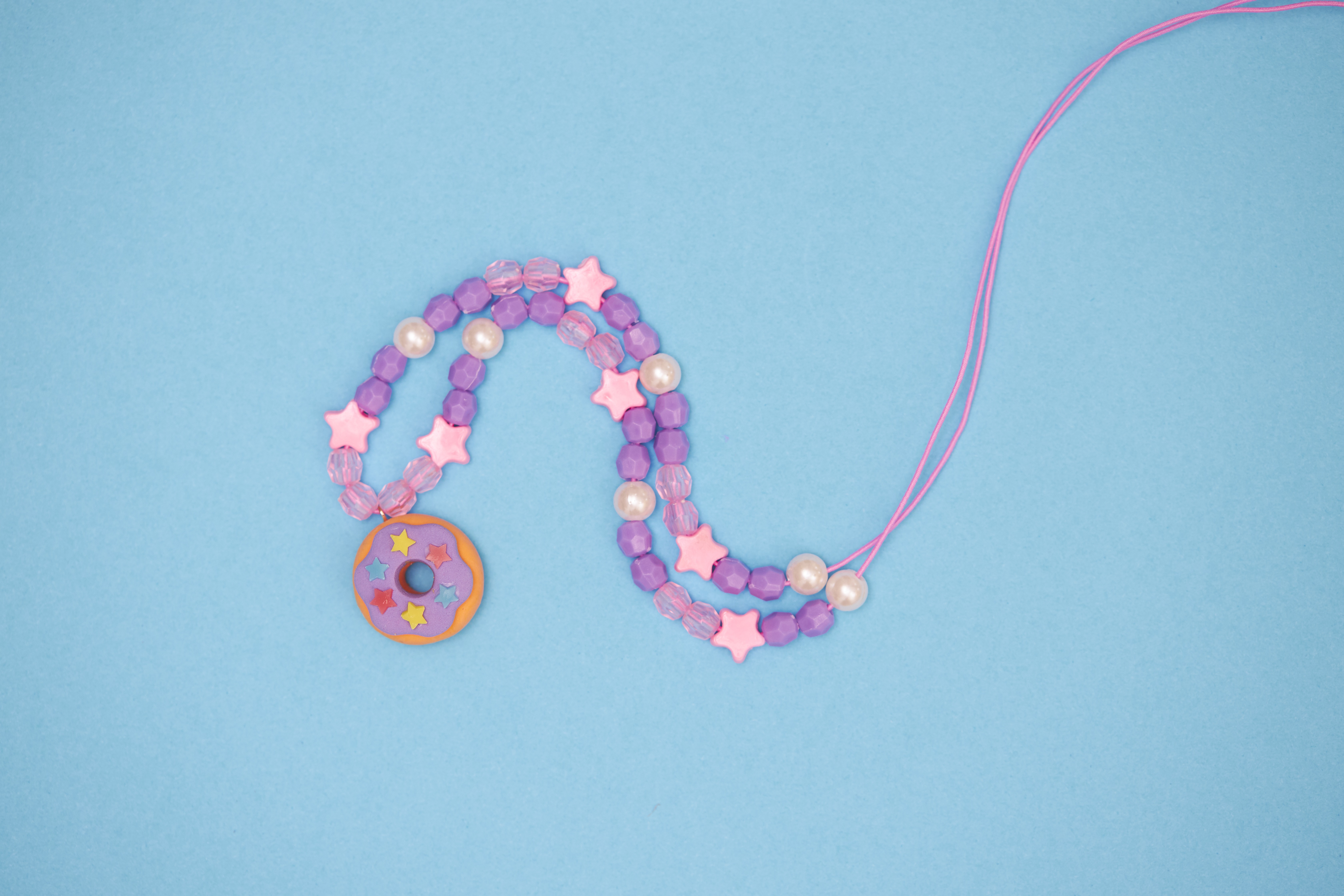 Dab glue on the eye screw, then gently stick it in the donut. Let your donut air dry for 24 hours or until it turns into a hard solid. Now string it with some pretty beads and turn it into a one-of-a-kind necklace or keychain!