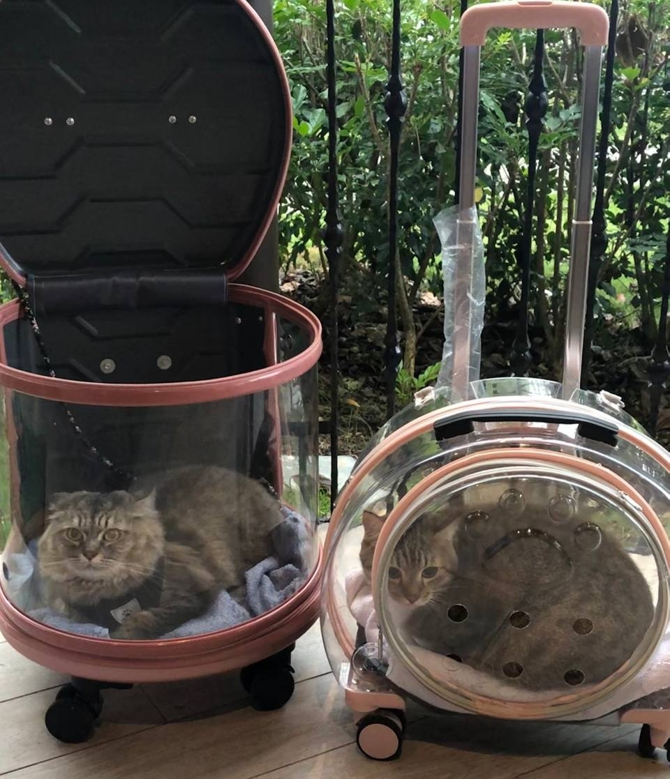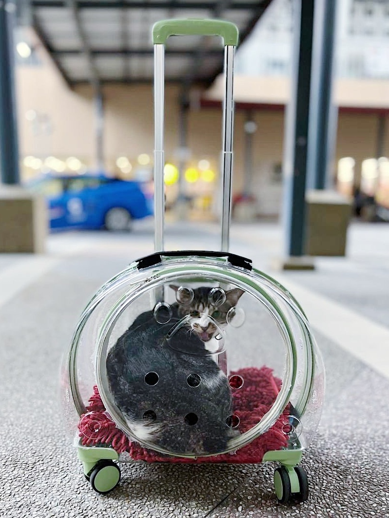 Cats are often wary of their surroundings. The La Chariot pet trolley is a transparent luggage-like trolley that keeps your cat in a safe space while allowing it to look out, and most importantly allowing it to see you, so it feels safe.