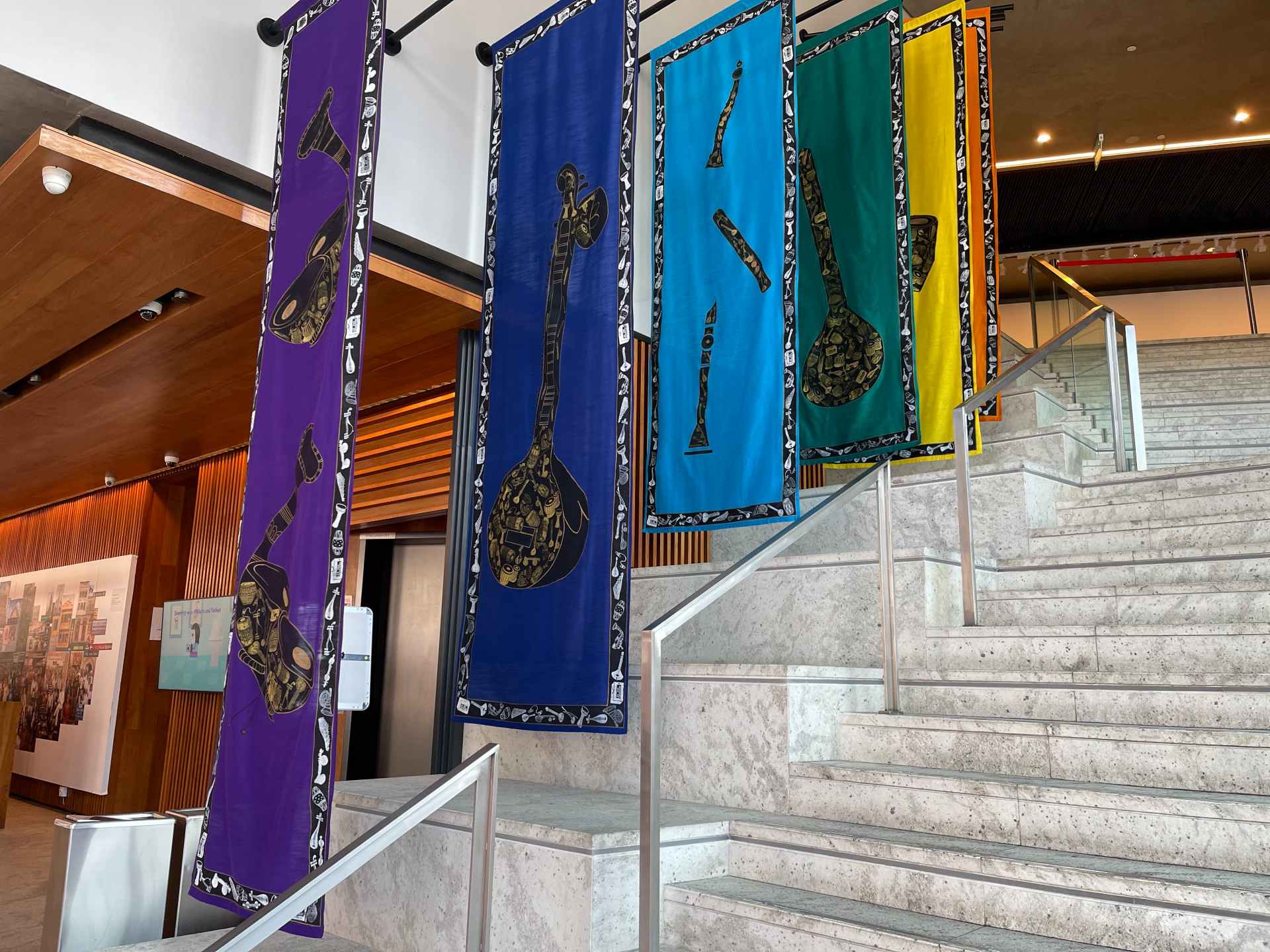 Be wowed by intricate fabric block print hangings of traditional Indian musical instruments, created by Singapore-based artist Sunaina Bhalla and displayed prominently along the main staircase of the India Heritage Centre.