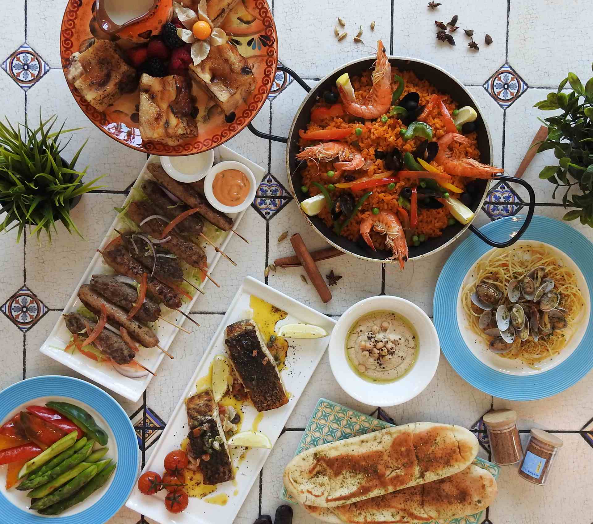 Dishes are served a la minute in the spacious dining hall appointed in a beautiful blue-and-white seaside theme. From the Mediterranean line-up, look forward to things like braised lamb shanks with Moroccan spices and kabsa (a fragrant rice dish) and pocket pitas stuffed with minced beef, cucumber, tomatoes and tahini.