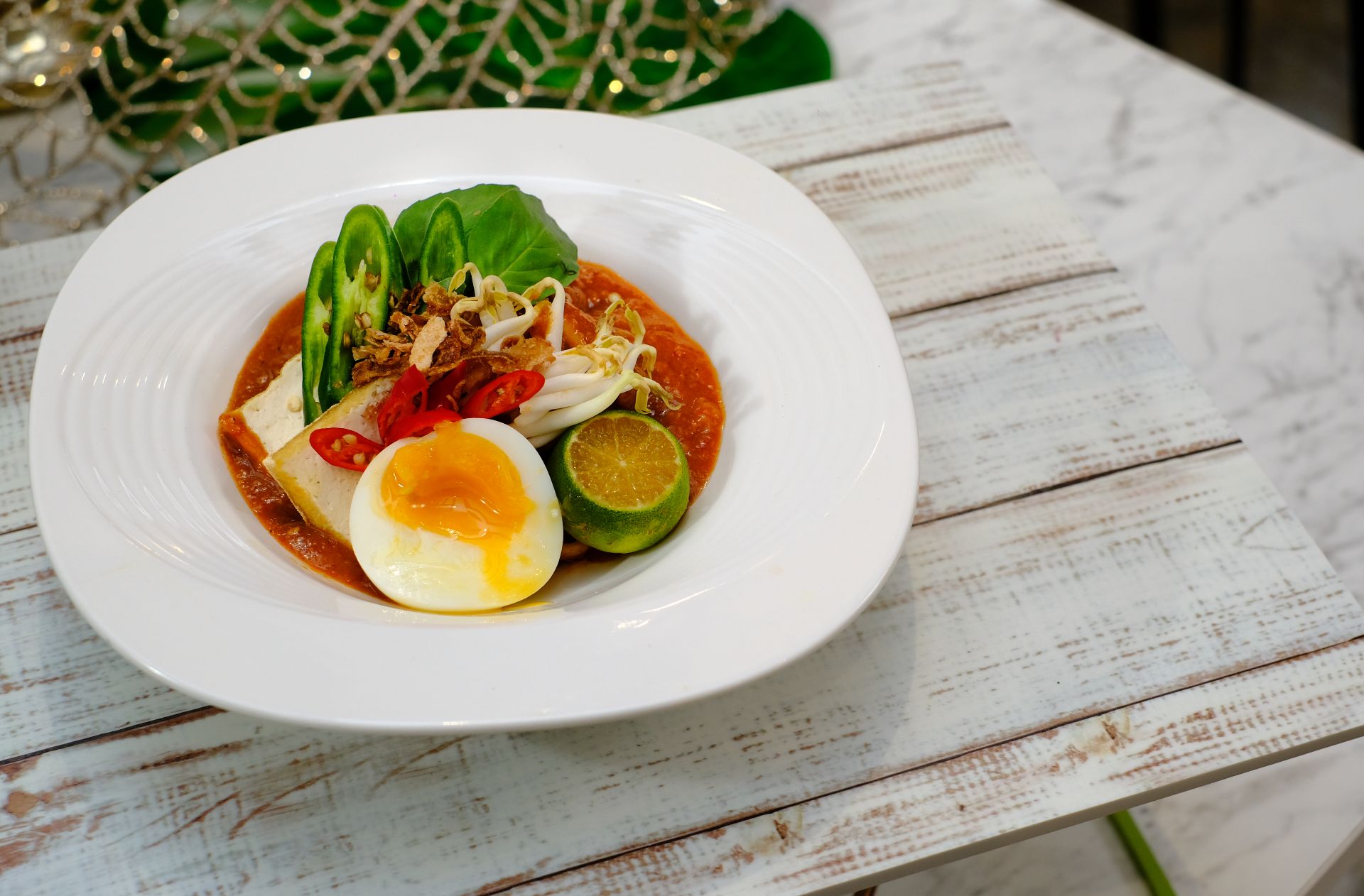 Also on the menu is mee maidin, an iconic dish created in 1940s Kampong Gelam comprising yellow noodles in a thick prawn gravy topped with fried bean curd, fried shallots, green chillies and lemon basil.
