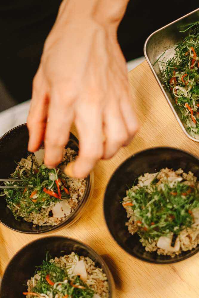 As for the jasmine rice, I cook it with chicken stock, fish sauce, salt and dried cuttlefish (which is an umami component). I season it quite heavily and steam it. Then I mix both types of rice, and season it with a laksa leaf relish.