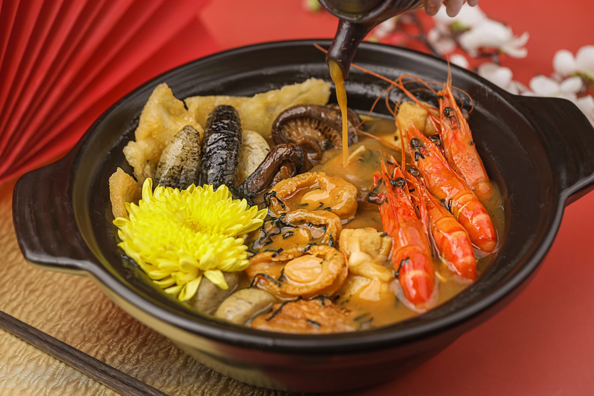 If yours is a small party, then Jidai Restaurant’s Set Menu ($238) for up to four people is a great option. The centrepiece of this menu is the Black Truffle Nori Pencai, brimming with auspicious ingredients like abalone, fish maw and Chinese mushrooms. A generous shower of black truffles and nori give it a decadent edge. You also get the Eight Treasure Basmati Rice in Lotus Leaf so you can watch your GI levels while scarfing a Chinese New Year classic studded with French deep-sea crab meat and chestnuts. For roughage, there is Charred Broccolini with Sesame Dressing and Roasted Almond.