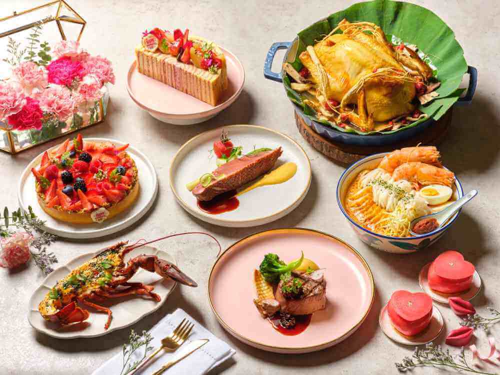 Local delights, Chinese flavours and French classics are the order of the day at Racines, where the regular menu is split into French and Chinese sections. For Mother’s Day, all that comes together in a lavish buffet (from $138) on 14 May, which will feature elevated offerings like pan-seared sea scallops with fennel confit, six-hour French Magret duck breast with orange reduction, and baked rock lobsters with garden basil Bearnaise. From the Chinese station, expect seafood porridge, braised sea cucumber with seasonal vegetables and steamed ginseng chicken.