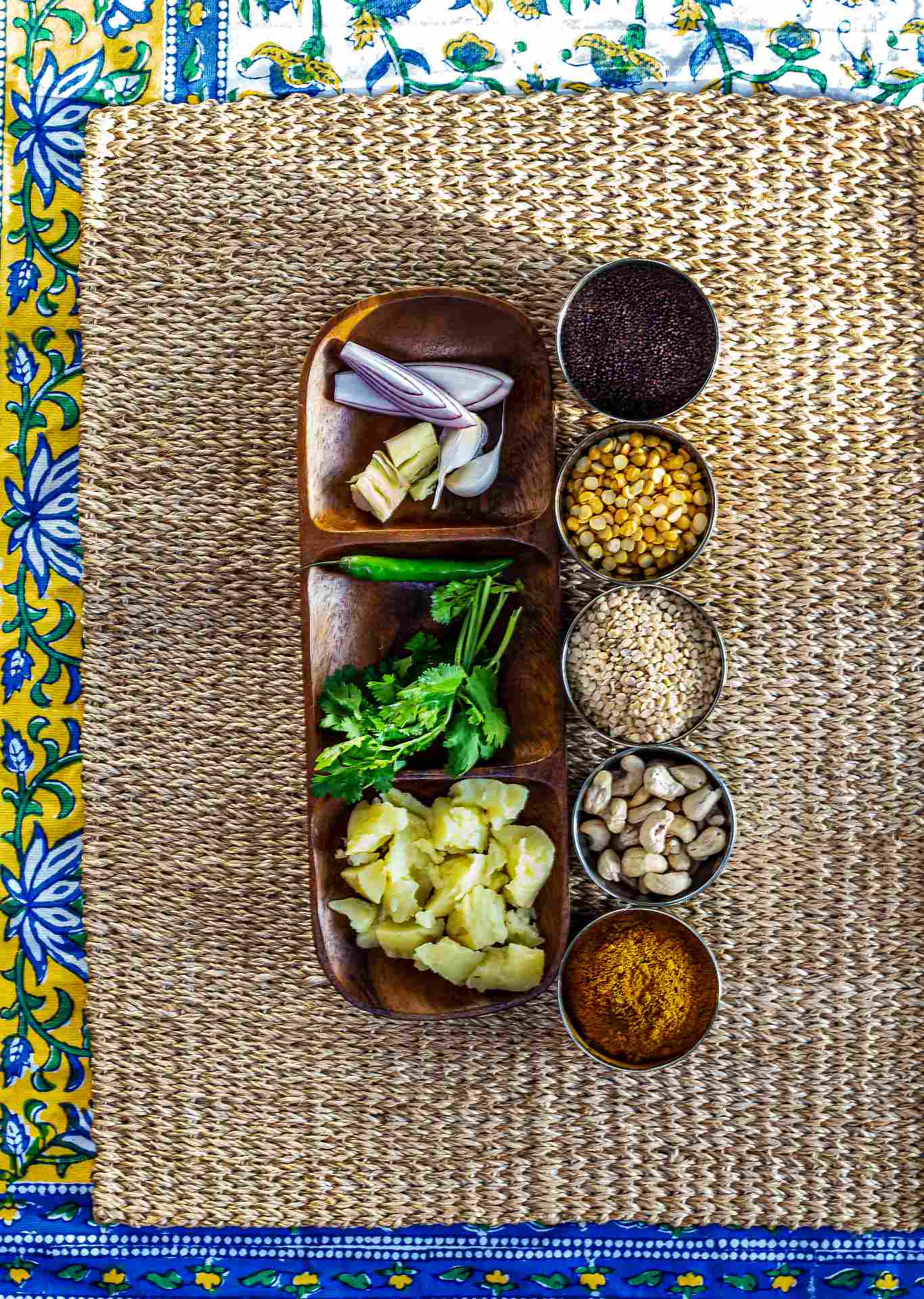 2. In a medium pan, heat peanut oil on medium heat. Add mustard seeds. Once they begin popping, add split urud dal, channa dal and cashews. Toss continuously with wooden ladle so that they don’t burn.