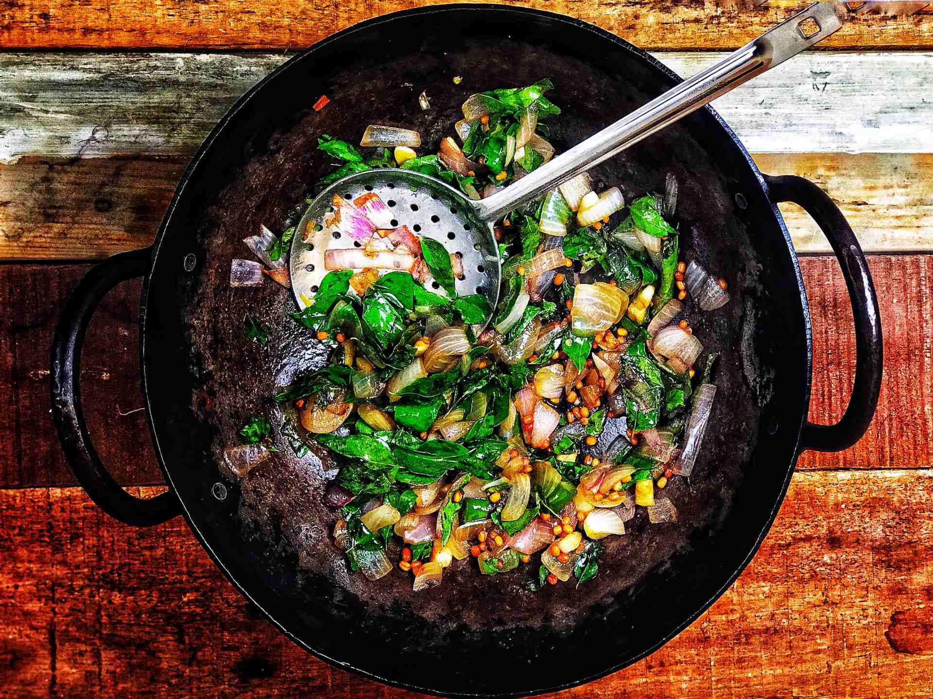4. Add tamarind and curry leaves and cook till curry leaves begin to soften.