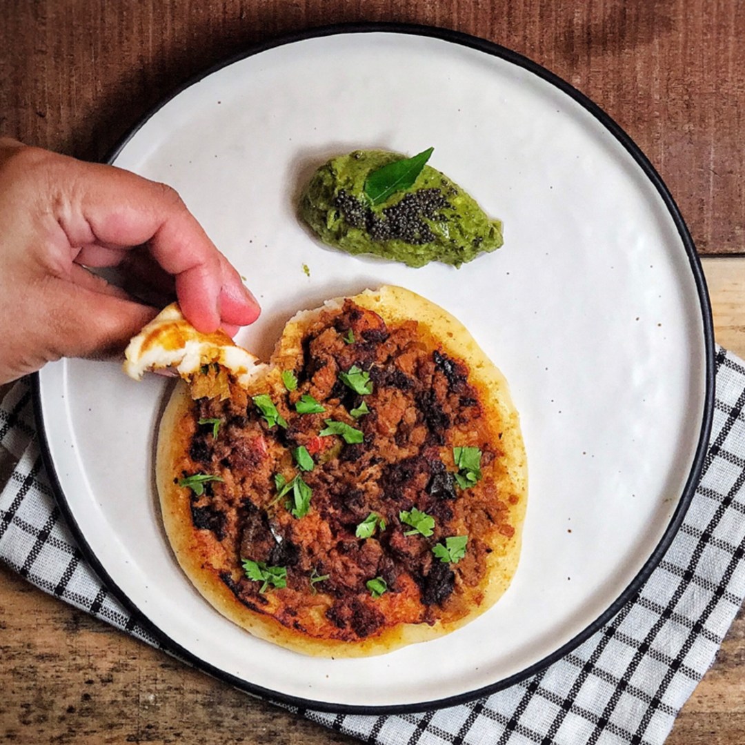 Drizzle 1-2 tablespoons of Keema Curry or any leftover curry and shredded meat on top and add minced onions and chopped coriander if you like.