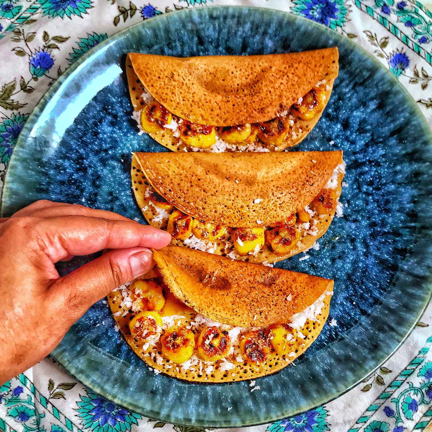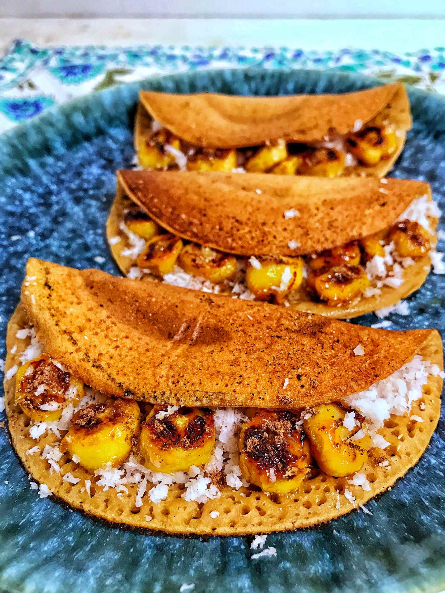 These dessert thosais are just sweet enough to qualify as dessert and wonderfully fragrant from the ground ginger, cardamom and coconut sugar. To enjoy these treats, roll them up into a cigar or fold them over like a taco to ensure every bite contains fresh coconut, caramelised bananas and the soft and moreish dessert thosais.