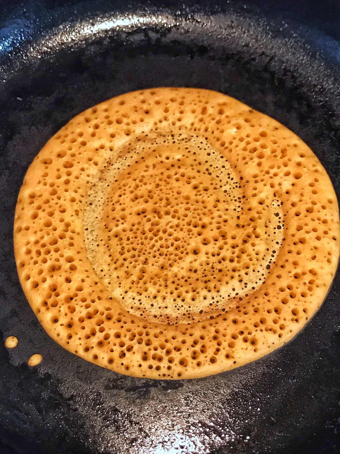 8. Leave the thosai to cook, undisturbed and uncovered for 30 seconds until bubbles appear. Leave to cook until golden brown on the bottom and the dough on top has all cooked. Use a spatula to lift the edges and check. You might need to give the edges a little nudge.