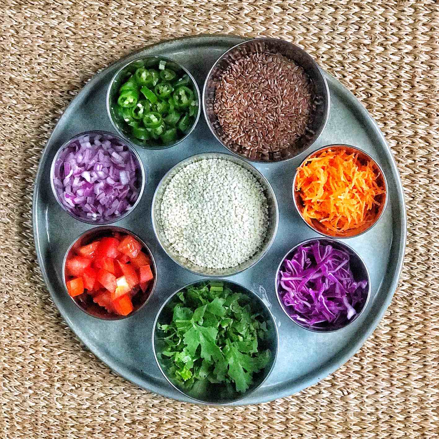 The fun part of making oothappams is in the toppings added to it. You could add any vegetables that are diced or sliced thinly or even add seeds such as sesame, flaxseeds and pumpkin seeds to add crunch and texture. I usually use up whatever vegetables are left in my fridge when making oothappams as it is a great way to use up that last bit of carrot or cabbage.