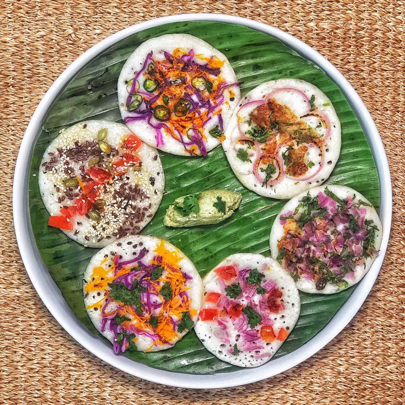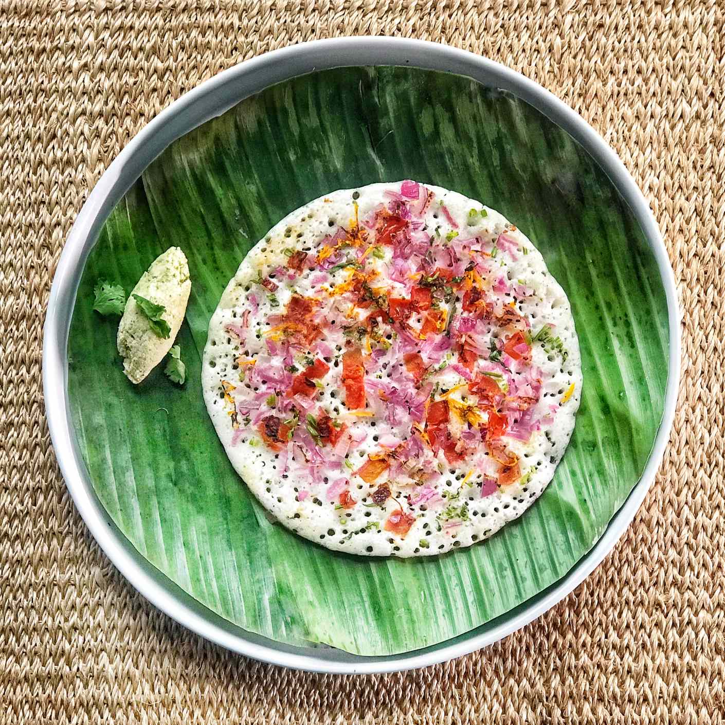 I’ve kept the toppings plant-based here but you could add anything you fancy, even grated cheese. My favourite topping on oothappams is lots of thinly sliced red onions and green chillies; the onions become sweet as they cook and brown just the right amount when flipped over while the chillies add a nice contrast of acidity and heat.