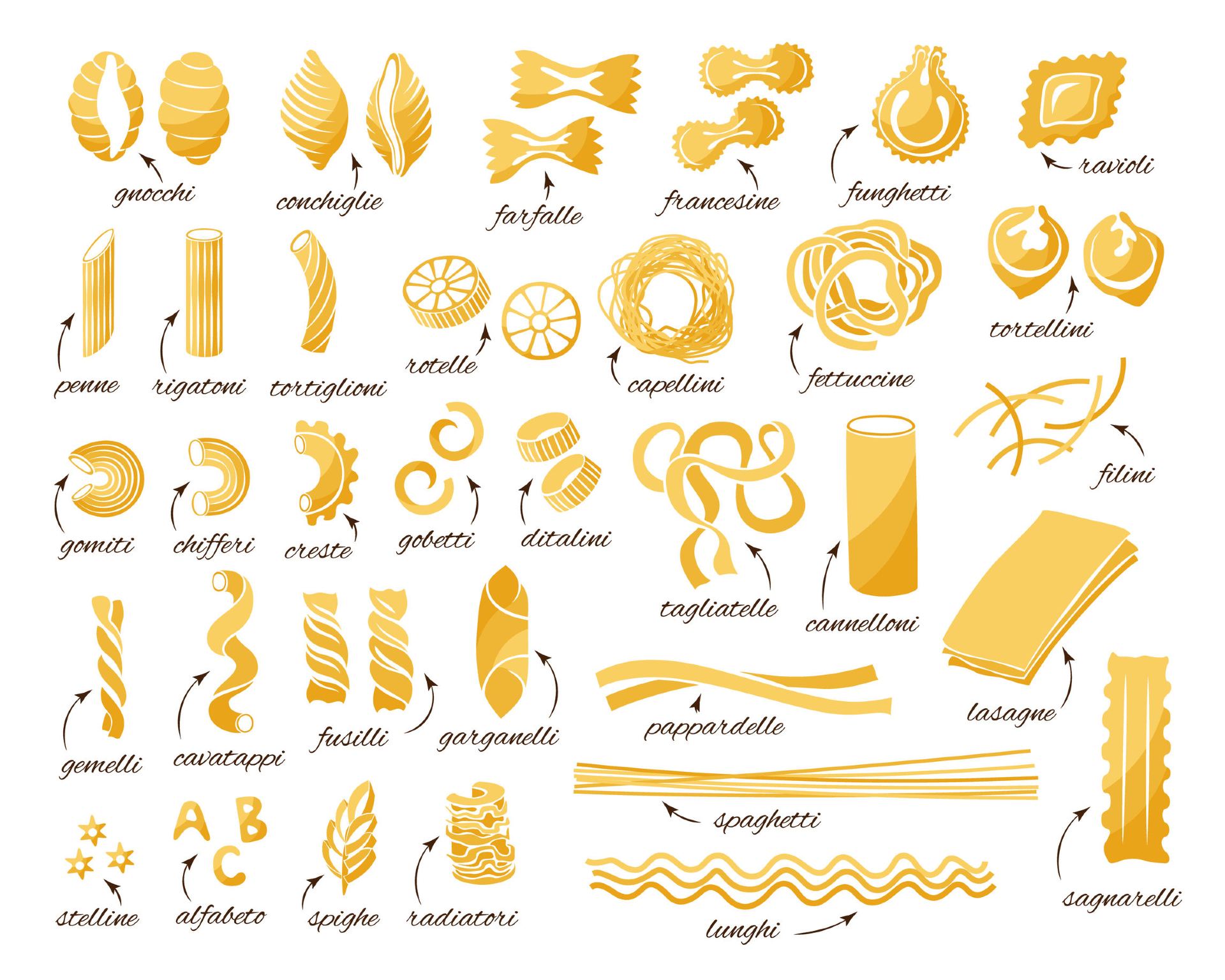 Among these, you probably know the common ones like angel hair, penne, and, of course, spaghetti.