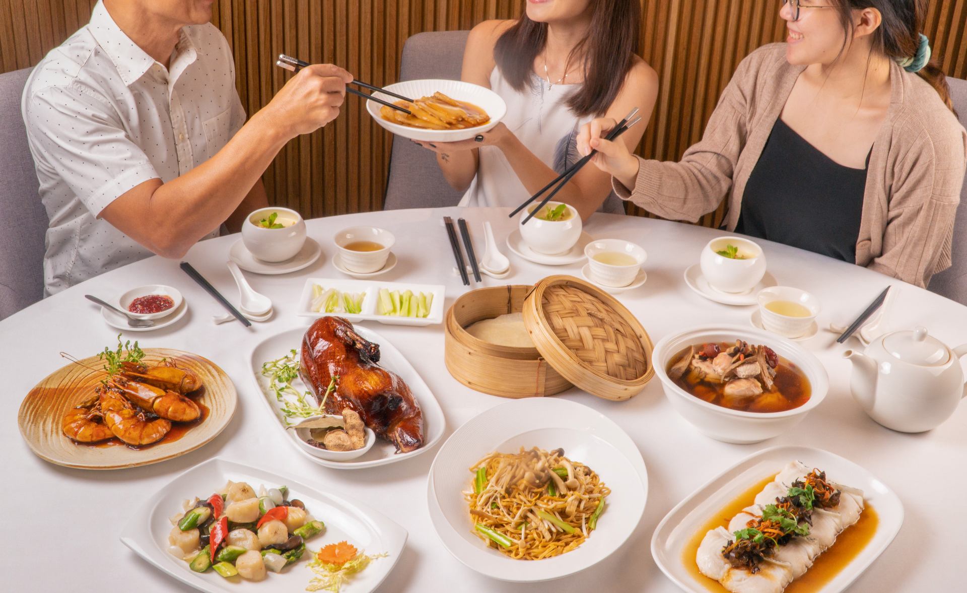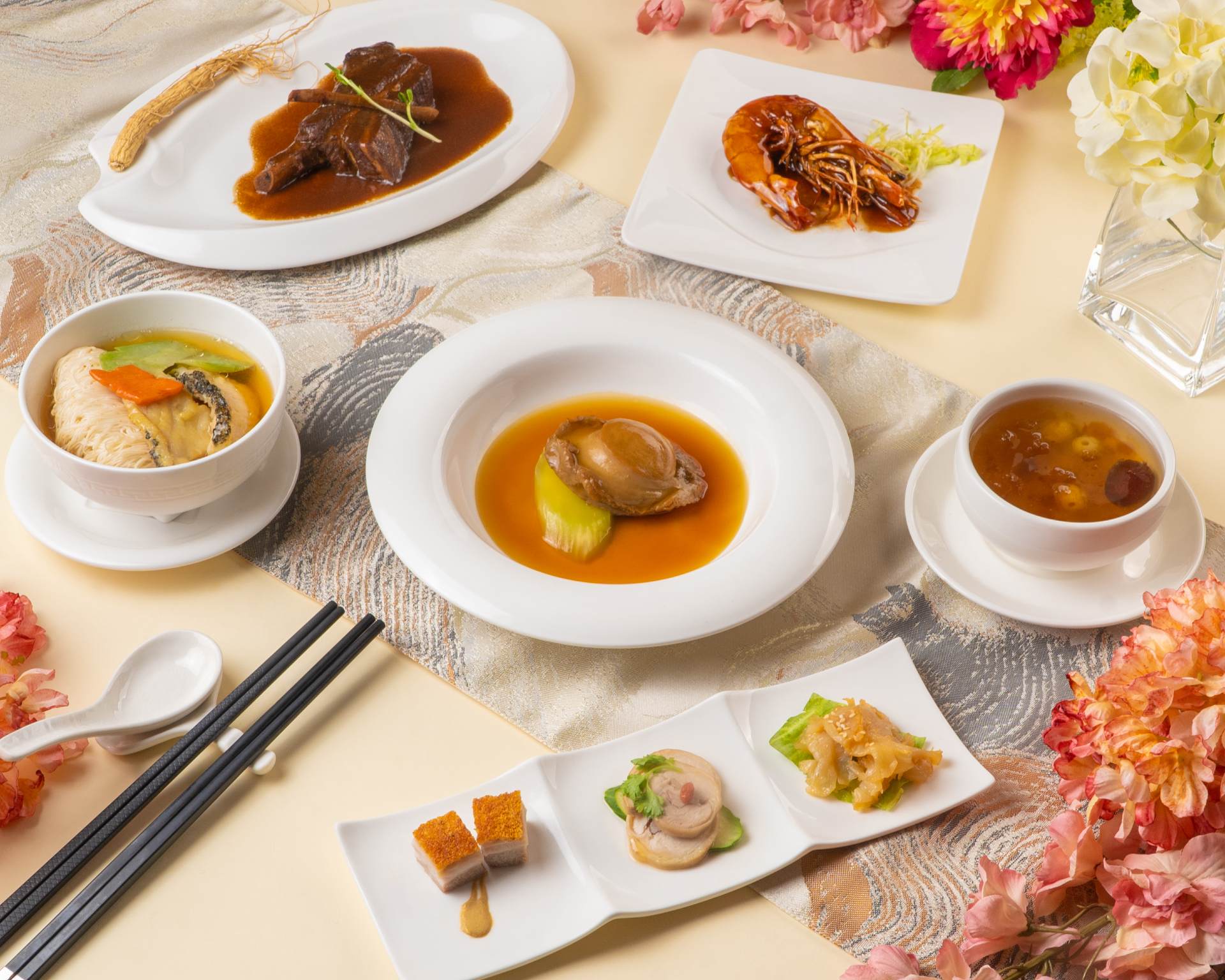Designed with help from Zhongjing Traditional Chinese Medicine, the dishes are formulated to provide nourishment while balancing our vital energies. Ingredients like mandarin peel (to nourish the spleen and lungs) and hawthorn berry (improves circulation and digestion) are used in dishes like roasted pork belly with chilled jelly fish and white sesame, wok-fried spare ribs with ginseng sauce, and mee sua soup with grouper fillet, bitter gourd and wolfberries.