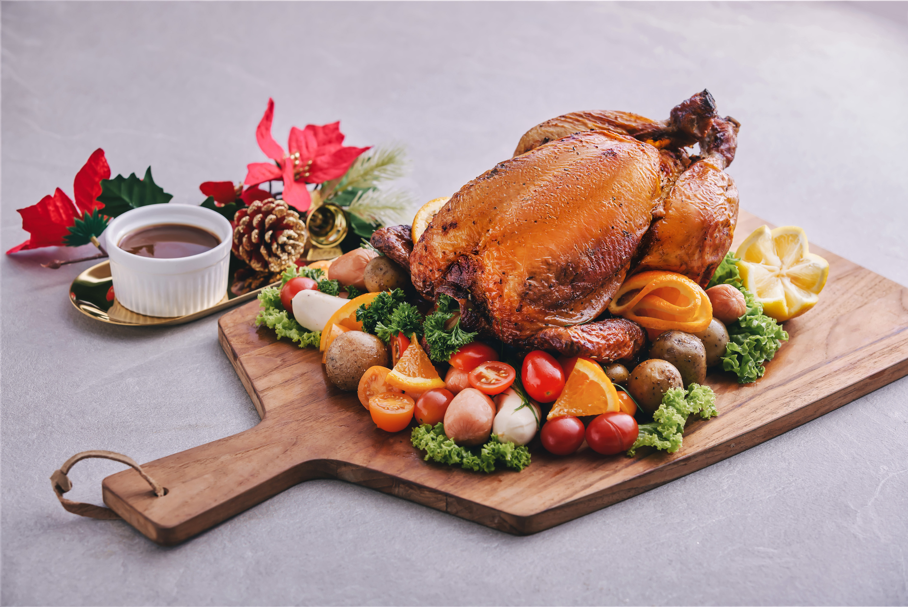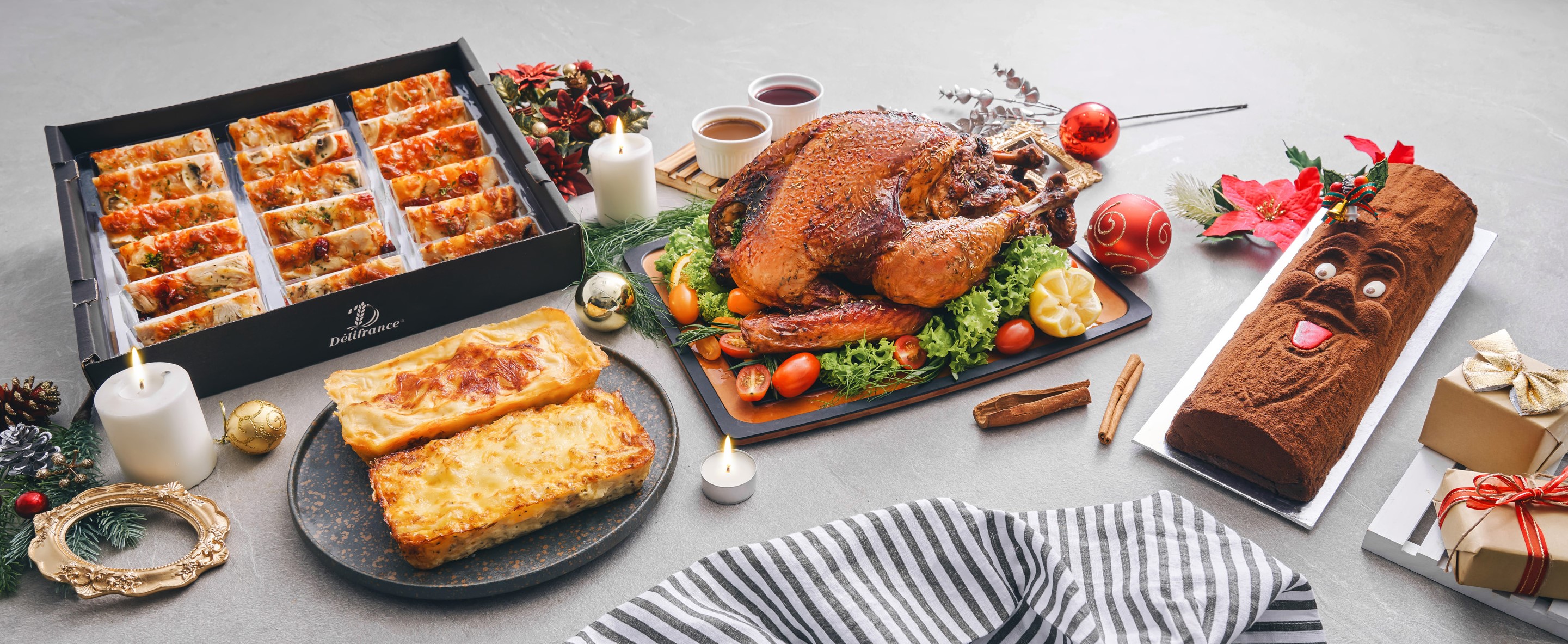 Good old Delifrance never disappoints. This season, the Halal-certified stalwart has a Grandeur Festive Table Set ($265) that will feed up to 10 people. It includes a 3.6-kg Rosemary Cranberry Turkey, Potato Gratin, Chicken Lasagne, assorted premium pizzas and a Joy of Delifrance log cake. If yours is a gathering of smaller eaters, order the Splendor Chicken Spread ($128) that comprises a roasted Citrus Herb Chicken, Potato Gratin and Mango Passion log cake.