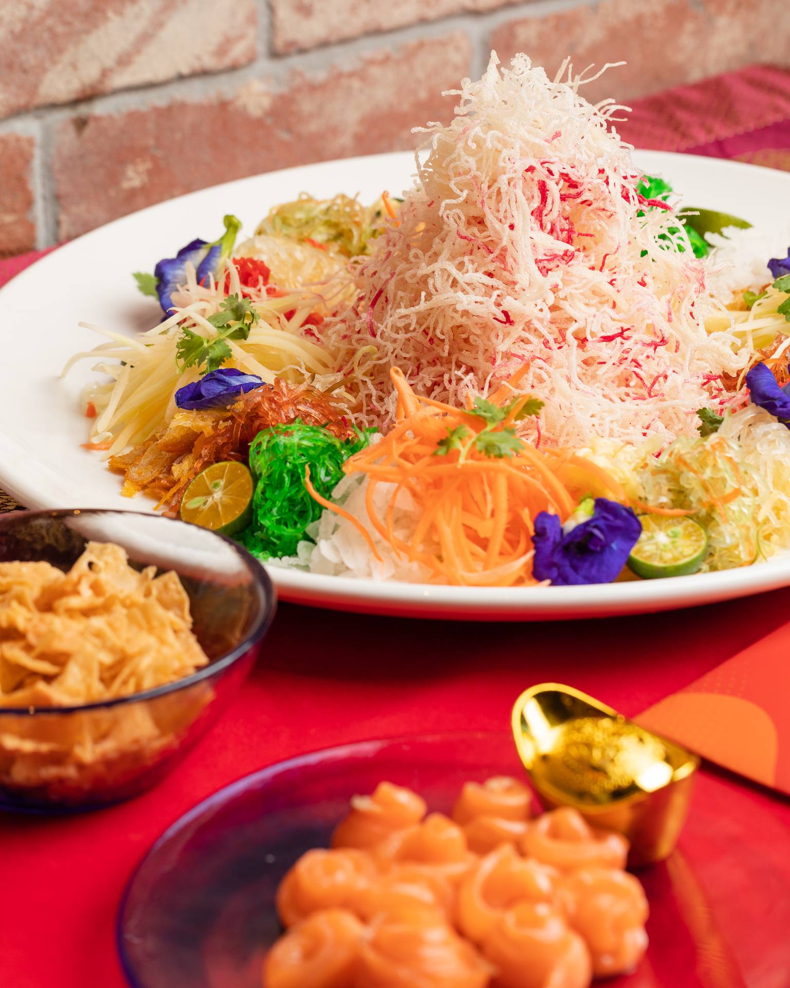 The Thais know how to make a good salad and this one ($68), with its mountain of crisp shredded rice crackers looks divine. The mix of vegetables include Thai green mango and papaya, pomelo and pickles tossed in a unique dressing made of plum and passionfruit. The yu part of the yu sheng comes in the form of silky slivers of smoked salmon.
