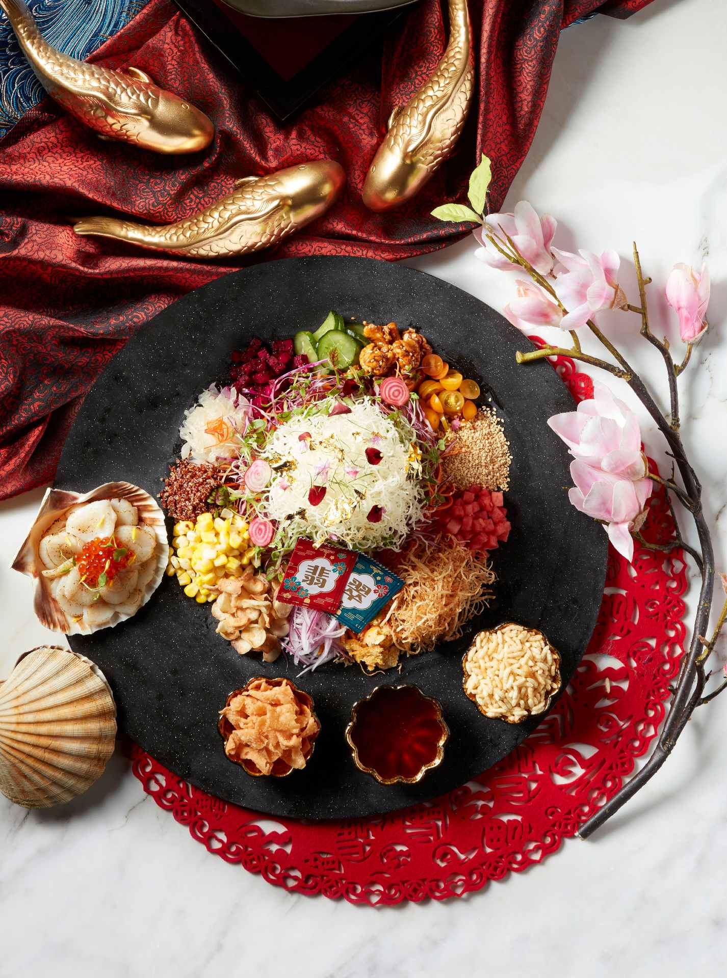 Yu sheng gets an artful contemporary touch with the addition of edible flowers and goldfish-shaped Japanese pickles that symbolise the fish migrating to a new spring. On the platter is also a hand-illustrated Chinese character, 春 (spring).
