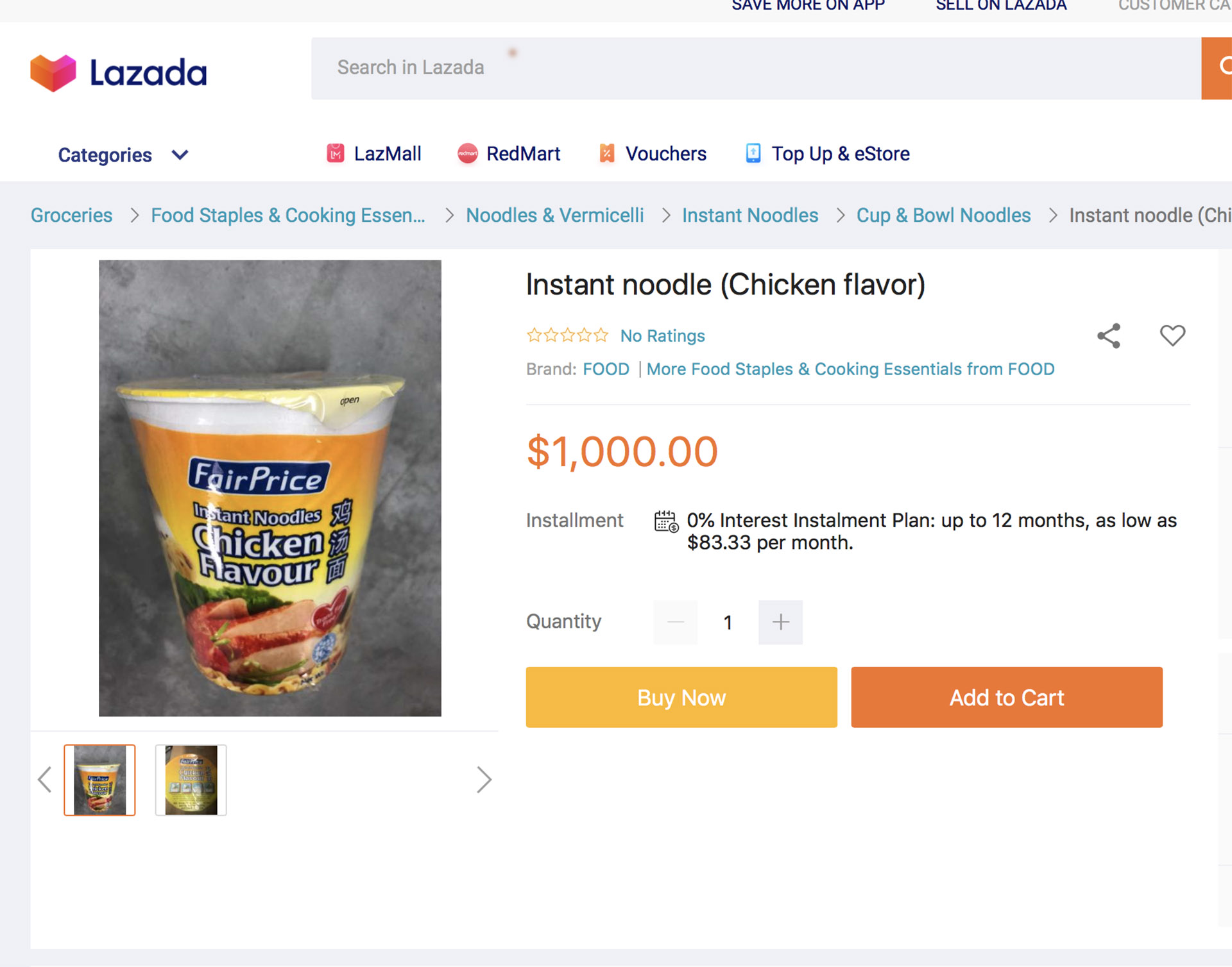 Anything from $1.50 a pack to… $1,000 for an NTUC Chicken Flavour cup noodles we spotted on Lazada (pictured above). We will tell you what the latter tastes like once we set up our GoFundMe account.