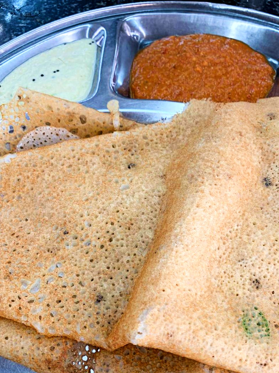 There’s tosai (or dosa), and then there’s rawa tosai. A crispier version made with semolina, ginger, crushed black pepper, and other spices, it is perfect when dipped in coconut and spicy coconut chutney. Don’t come too late cause at lunch, they serve banana leaf rice only.