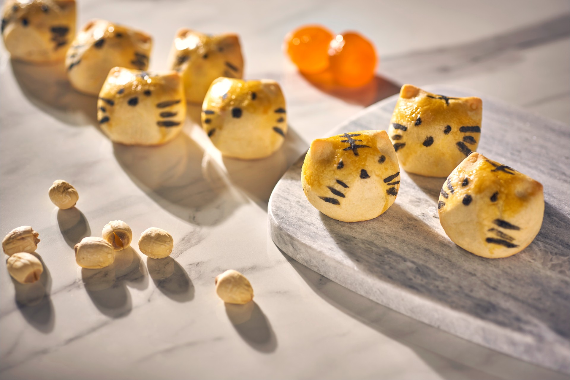 If you’re training young children to appreciate traditional mooncakes, these Year of the Tiger confections ($48 for six pieces) from Goodwood Park Hotel could do the trick. Shaped like cute kitten heads, their baked pastry shells are filled with lotus seed paste and a quartered salted egg yolk. Just enough to help the little ones learn to love those quintessential flavours.