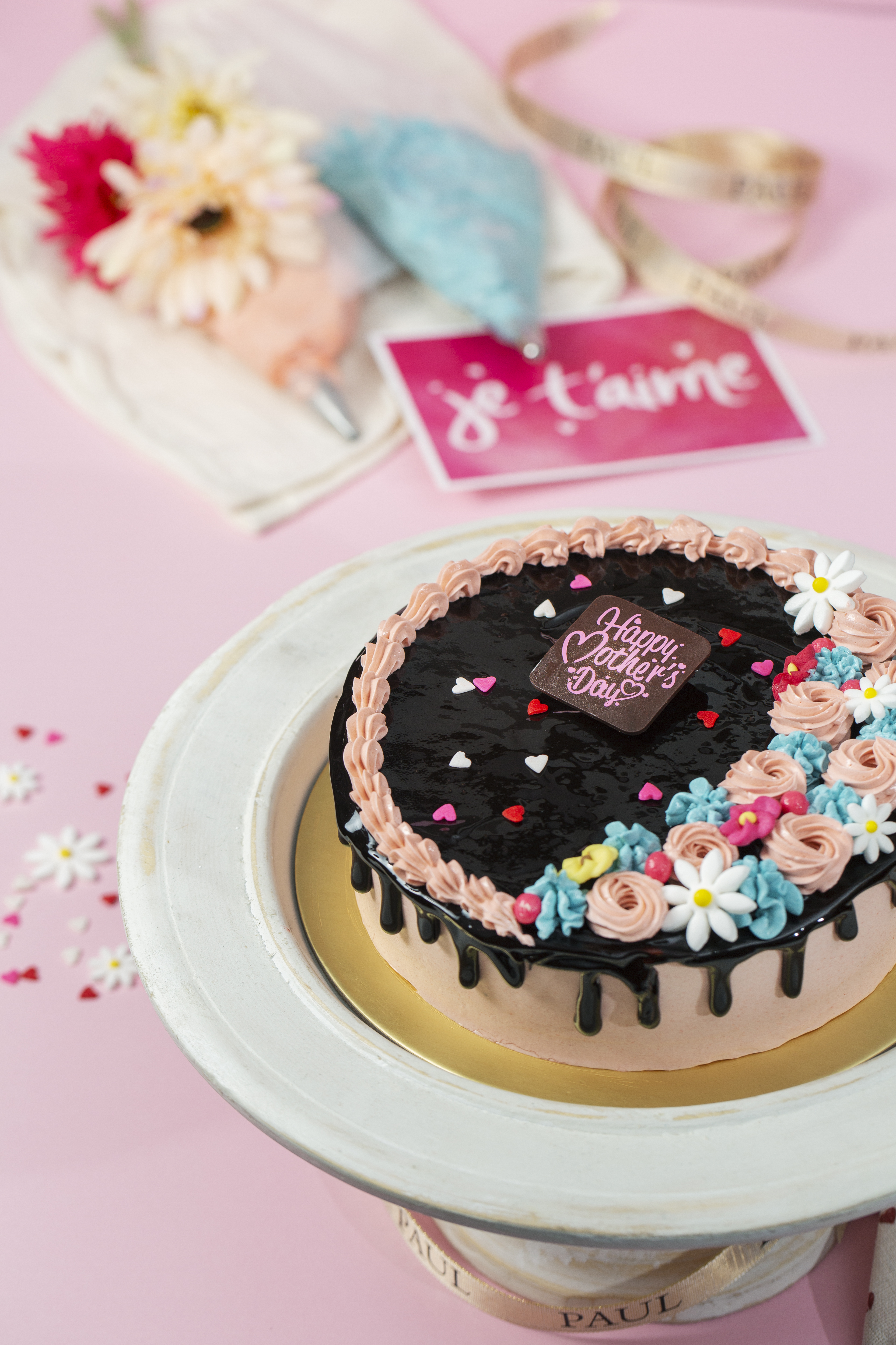 Mums with young children might appreciate a fun-filled bonding session over chocolate cake, sugar flowers and frosting. Everything from dark chocolate ganache, a chocolate tag that says “Happy Mother’s Day”, sprinkles and piping bags of pink and blue buttercream are neatly provided for. All that’s left to do when Mum receives it is gather around the table with her little ones and have fun decorating the confection. This kit is anchored by a rich, moist chocolate cake layered with pink buttercream and fresh strawberries. Cuts between six to eight hearty slices.