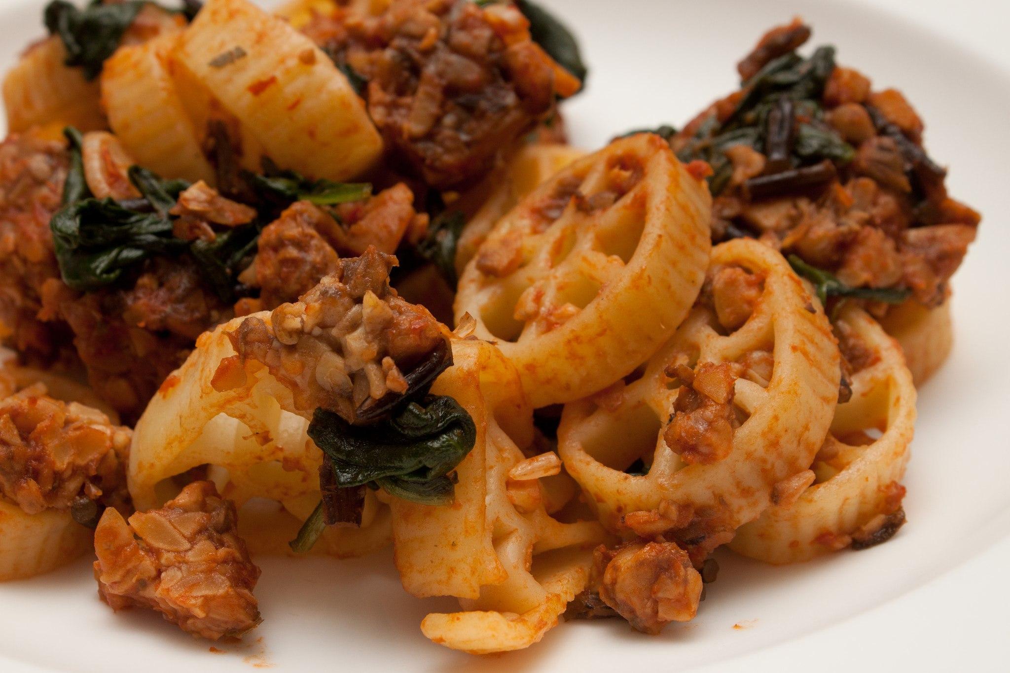 Eat it with: Thick and dense sauces like bolognese, carbonara, alfredo sauce, and meat sauces.