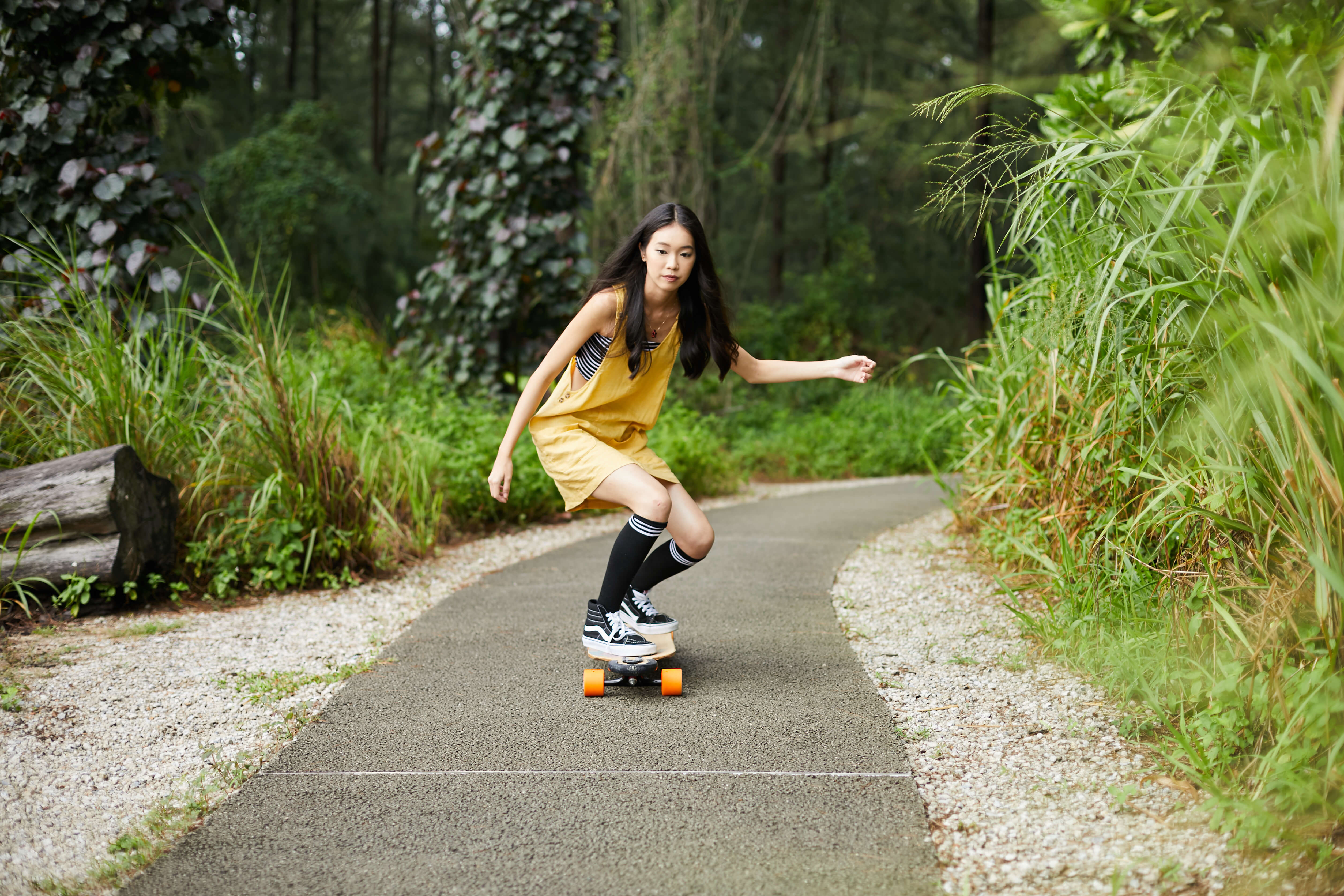 Very few people, even skateboarders like our model Dione Tan, can hop on a longboard without losing their balance the first time. “It is way tougher when you first start, but as you do it more often, your body will get it,” explains Nathan. Sure, you might incur a few bruises in the process of learning, but keep at it long enough, and your body will learn how to adjust its centre of gravity so that you can move on to tricks that require a little more hand-eye coordination.