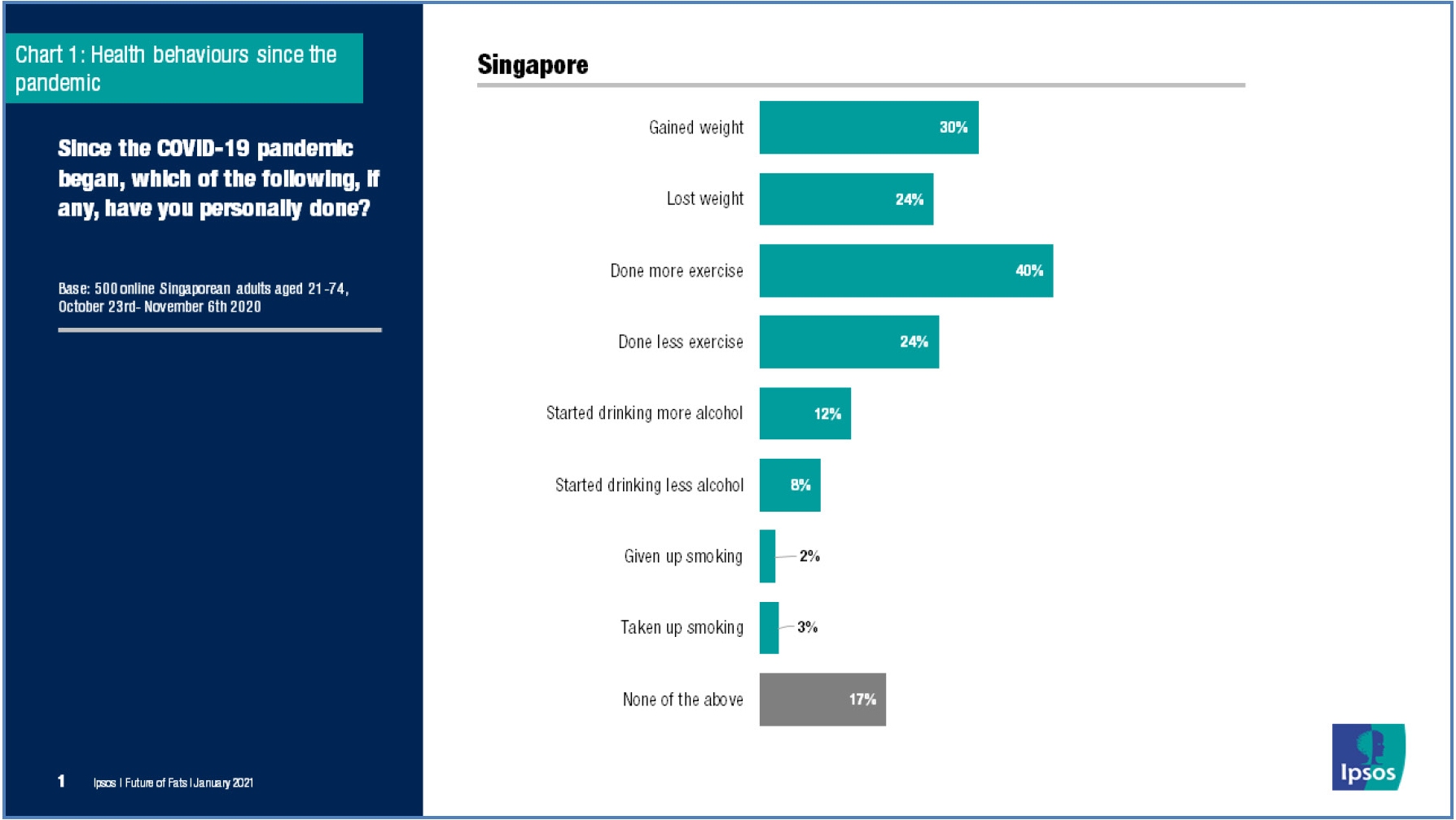 According to a study conducted by market research company Ipsos, 30% of the 500 Singaporeans (aged between 21 and 74) surveyed from 23 Oct to 6 Nov 2020 say they have gained weight during the COVID-19 pandemic with an average weight gain of 4.8kg.