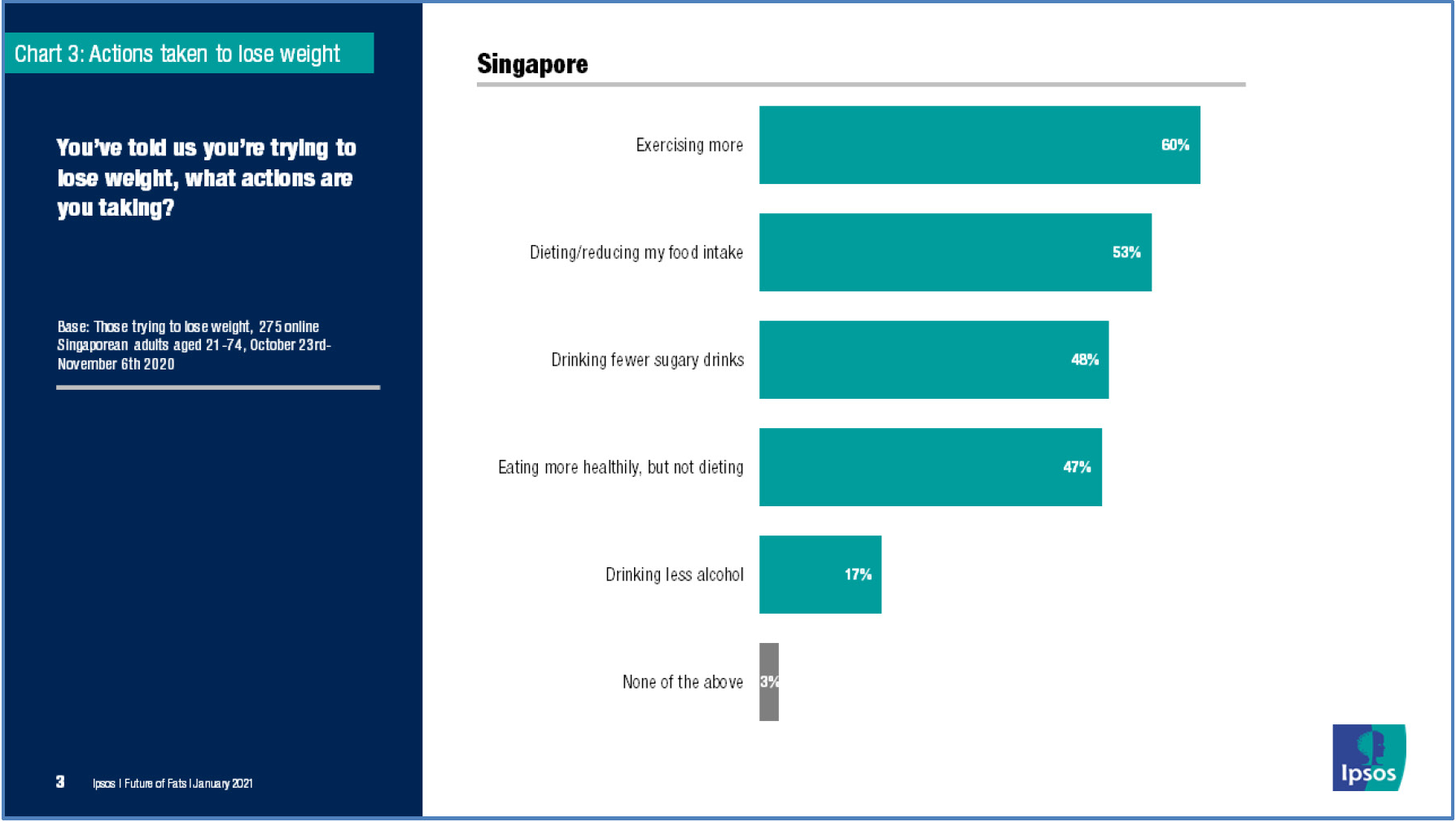 Among those who are trying to lose weight, almost two-thirds (60%) have begun exercising more, over half (53%) have begun dieting or reduced their food intake, and close to half (48%) are drinking fewer sugary drinks.