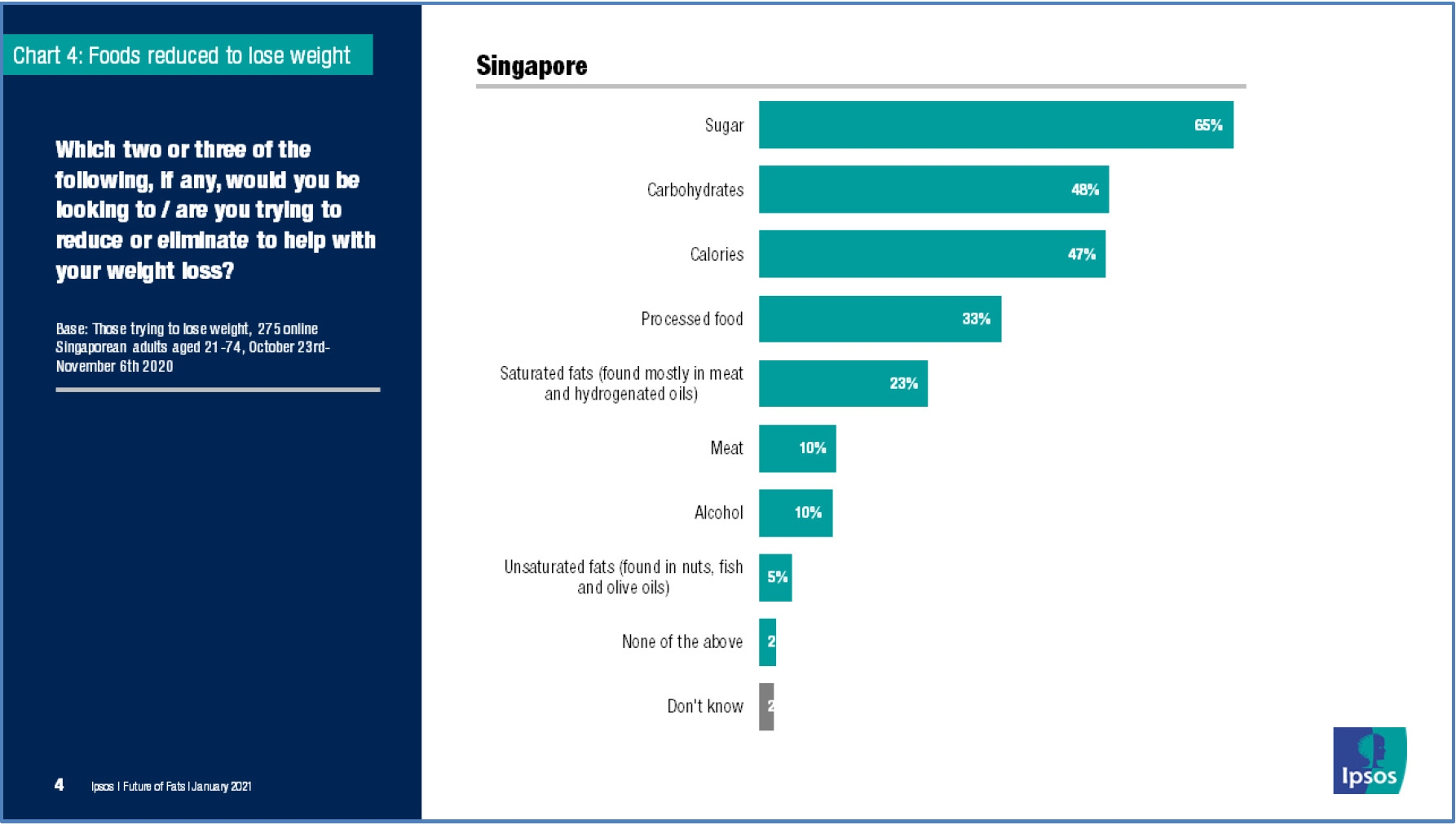 When asked what foods they would or were trying to eliminate to help with weight loss, a whopping two thirds of those surveyed (65%) said sugar (goodbye kopi, hello kopi o kosong), 48% said carbohydrates, and 47% said calories.