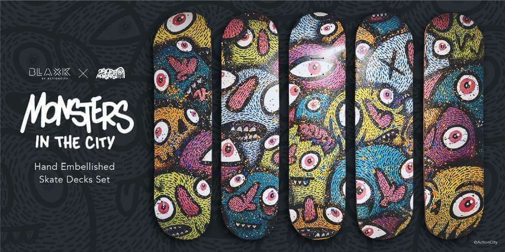 The exhibition held inside BLAXK by ActionCity at Funan runs till 16 Apr 2023, and includes over 40 artworks that showcase the artist’s versatility not only with acrylics on a flat canvas and illustrations on skate decks, but also in 3D sculptures and art toy collectibles as well as in the digital space – each physical piece is paired with a corresponding NFT.