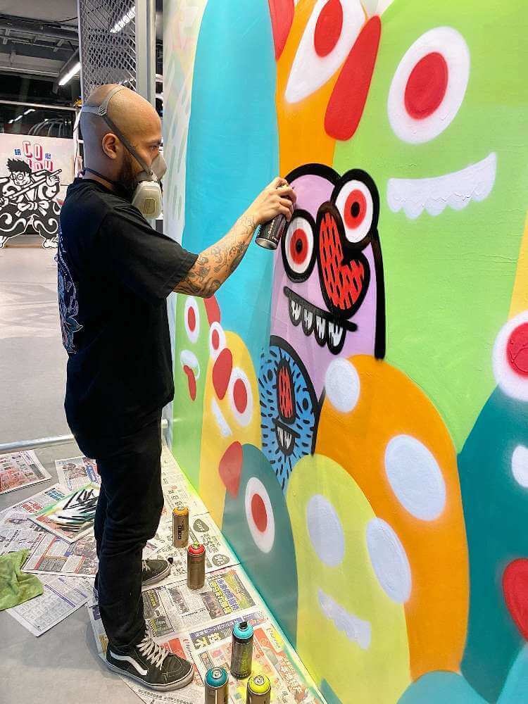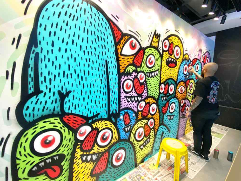 Distort Monsters spray-painting a mural at CO PLAY, located on Level 3 of Plaza Singapura. | IMAGE: CO PLAY