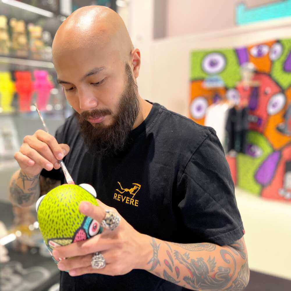 Touching up some parts of a Monster Head that the artist created out of acrylic and spray paint on resin. | IMAGE: SIM DING EN