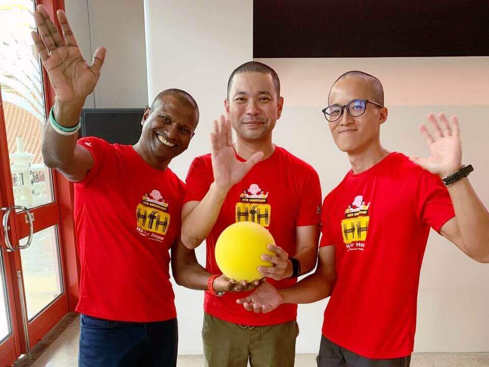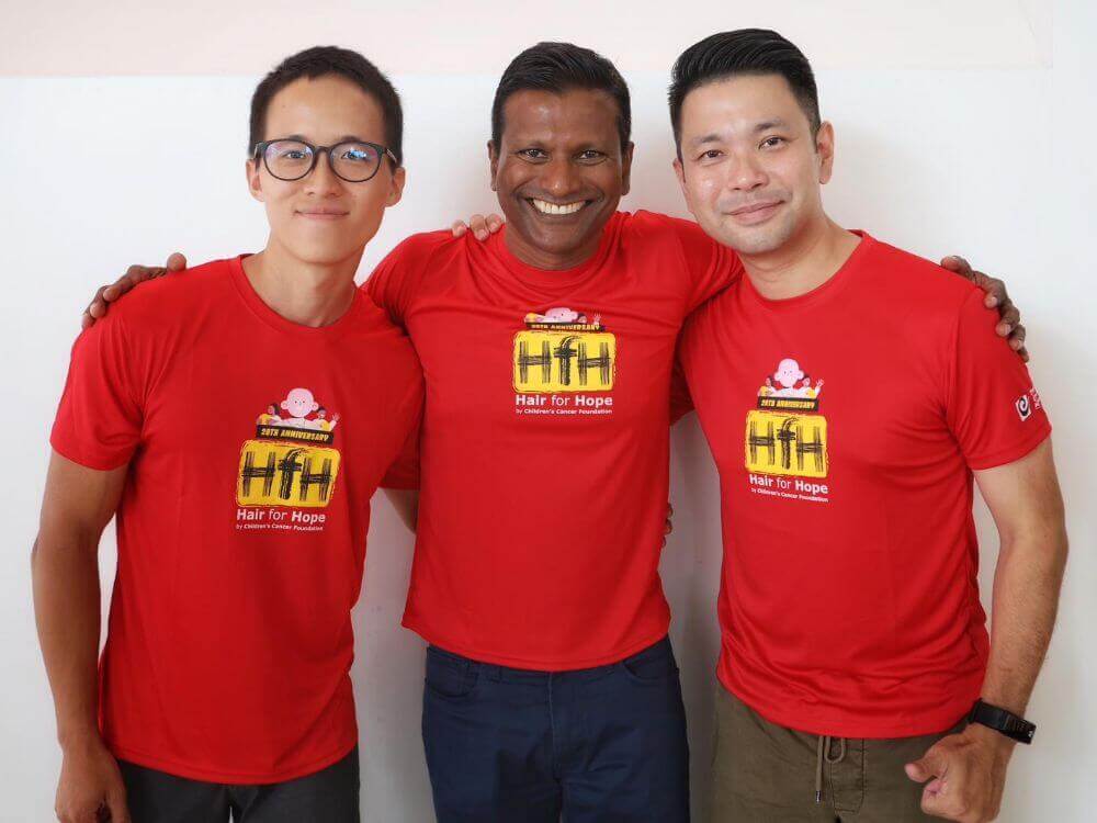 (From left) Clement is an HfH 2023 ambassador, Barathan serves on the CCF Board of Directors, and Norman shaves his head in memory of his father who passed away from colon cancer. | IMAGE: CHILDREN’S CANCER FOUNDATION