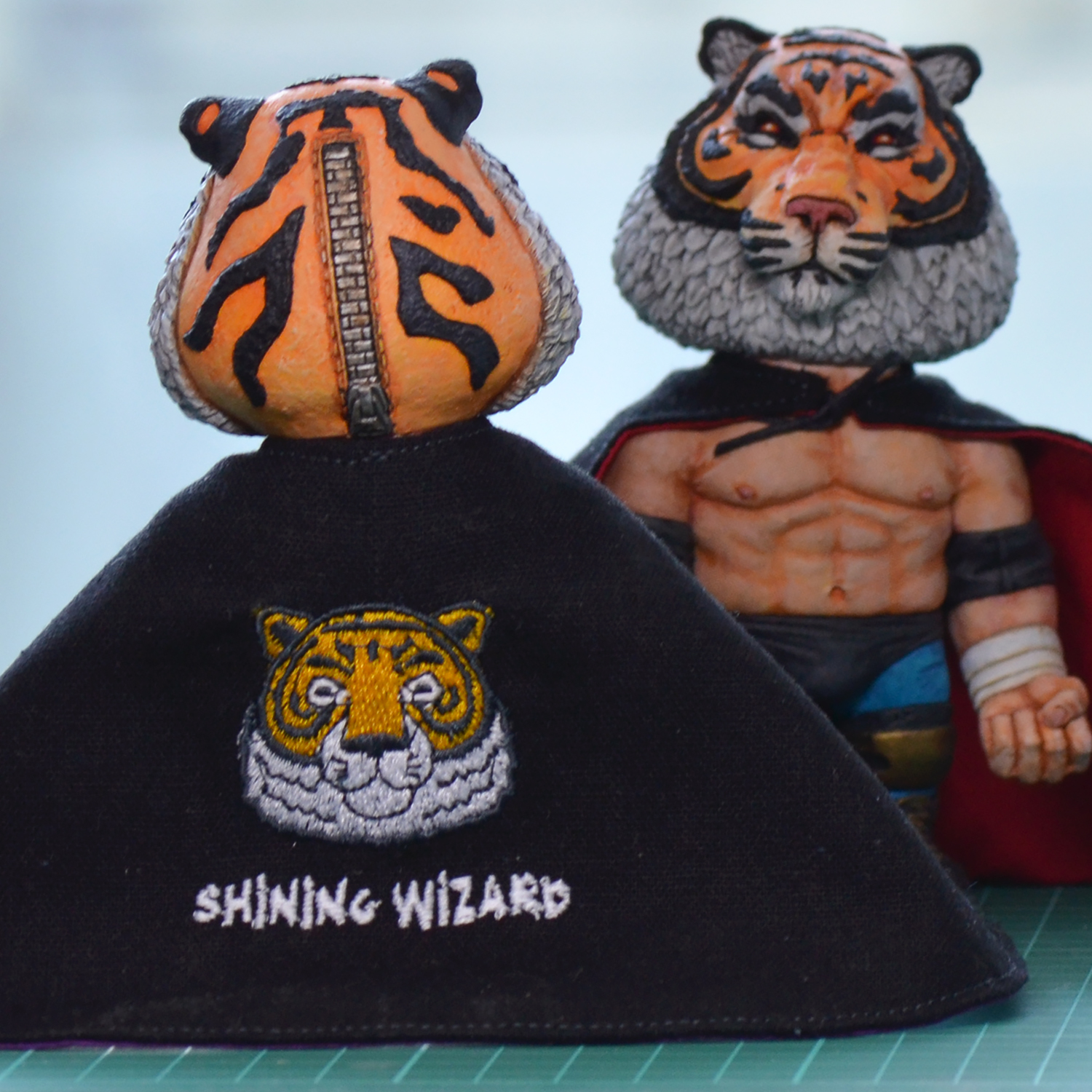 I came up with the character Shining Wizard (named after a wrestling move), a professional wrestler that dons a sacred tiger mask and is imbued with the spirit of the ferocious beast.