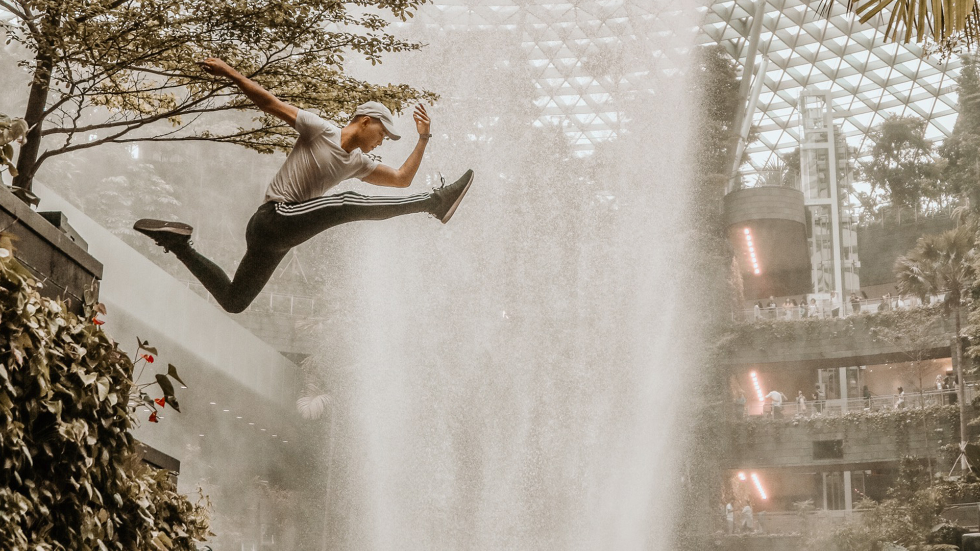 There’s a lot of trial and error involved in each shoot. For example, for the recent picture of me jumping in front of the waterfall at Jewel Changi Airport - that’s just me being crazy and adventurous, and suggesting we take a photo of me jumping off the stairs 2m off the ground, just because I thought it would be cool! We literally just went for it, even though it was a bit dangerous. It only took two or three shots to get this image, but boy was it scary! There’s a lot of communication to and fro between Thecla and me. Sometimes I would suggest a certain angle that would work better for my lines. Other times, Thecla would suggest a certain movement that would look good and complement the environment.