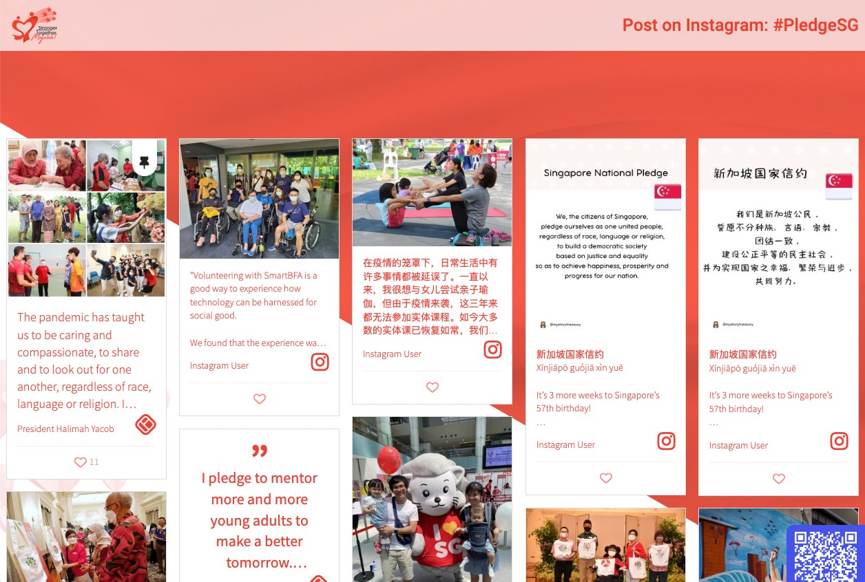 #PledgeSG invites you to pledge your support for worthy causes and express gratitude, hopes and wishes for Singapore and your fellow Singaporeans. You can pledge via your Instagram or Twitter account with the tag #PledgeSG, or through the dedicated #PledgeSG website. You're also encouraged to share your pledges to the "live" online social wall on the #PledgeSG website to inspire your fellow Singaporeans.