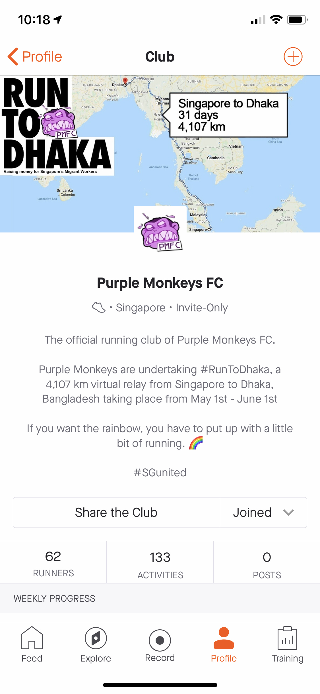 The club’s Run to Dhaka commitment is through May, which means that each Monkey has to put in an average of 3km to 4km per day - no easy feat, considering that most have to manage full-time jobs and parenting. They clock their distances on the running app Strava (which the public can track by following ‘Purple Monkeys FC’ on it), and the team posts its progress on its social media pages.