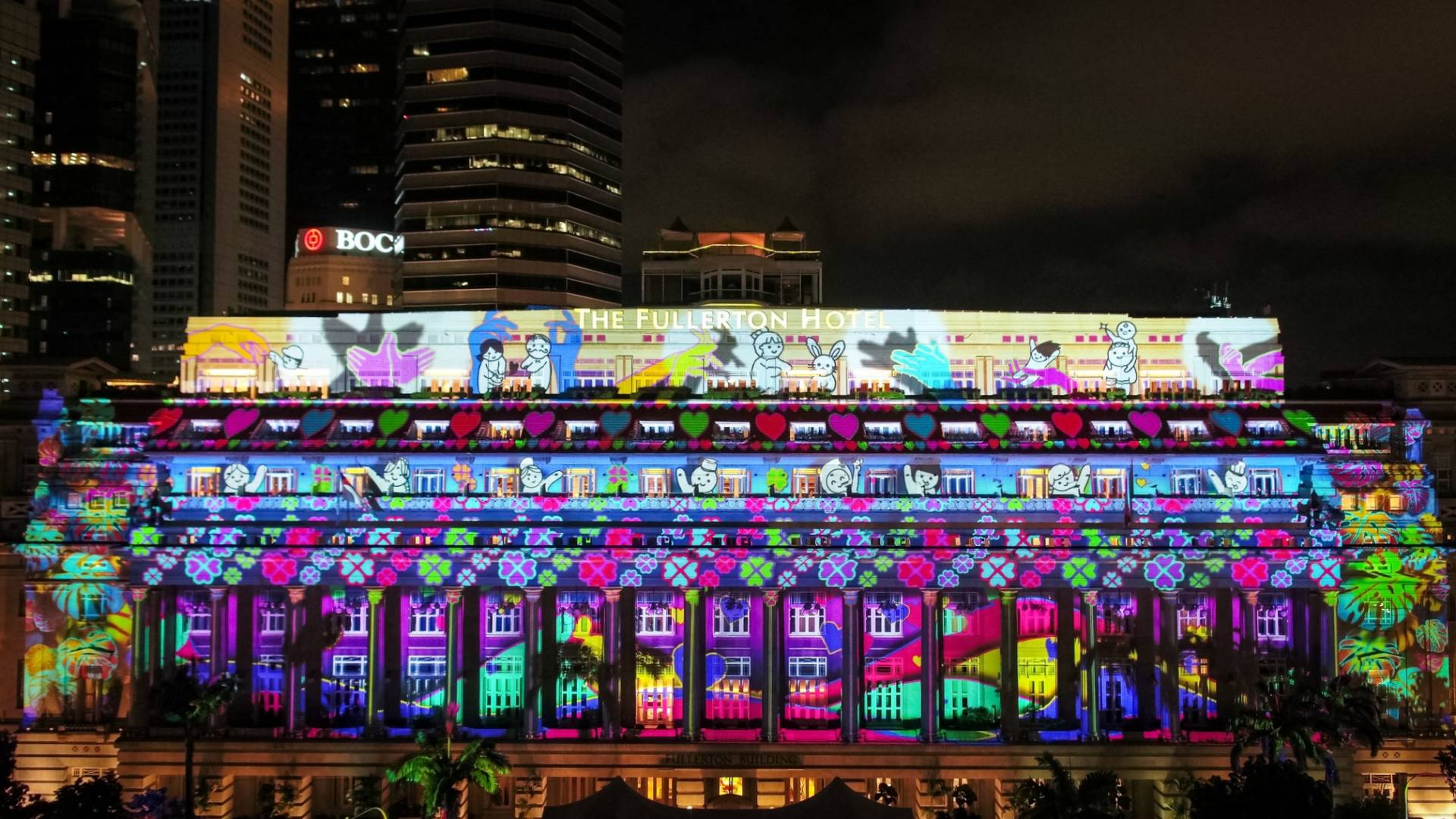 Pictured here on the facade of The Fullerton Hotel Singapore is a piece by How Hee Lin of the Singapore University of Social Sciences that depicts a multitude of multicoloured hands which represent the President's Volunteerism & Philanthropy Awards 2021 nominees who have lent a helping hand towards various causes.