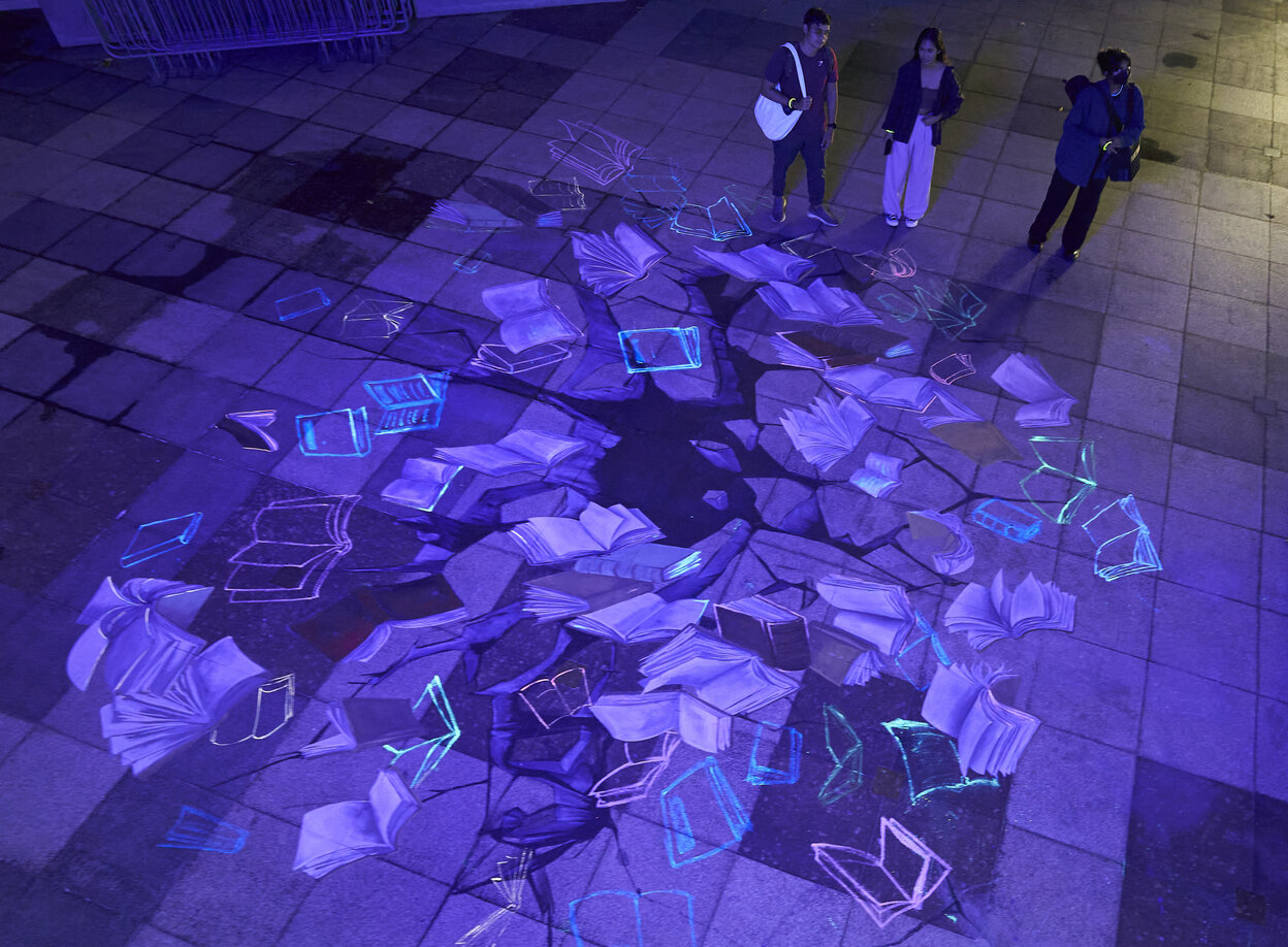 "City of Books" is the coolest one of the lot. The large-scale anamorphic pavement mural inside Bras Basah Complex features books flying into a void through a one-point 2D plane perspective. It pays tribute to the heritage and history of Bras Basah Complex as a retail mecca of books.