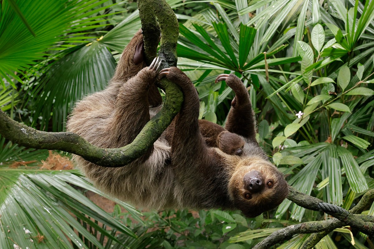 Fun fact: Linne's Two-toed Sloths cling to their mum’s belly for the first 9 to 12 months of their lives before finally detaching to climb and eat on their own.