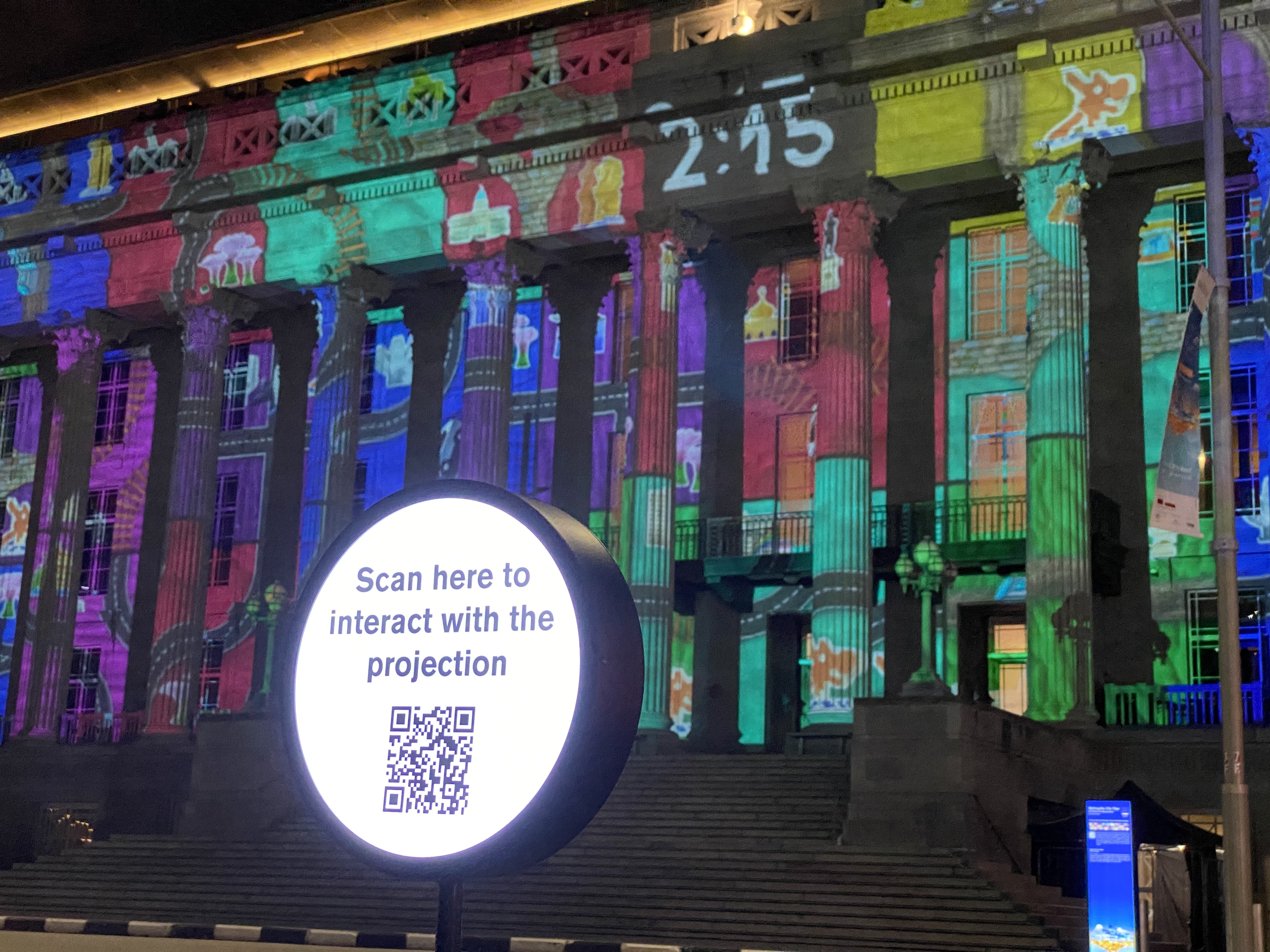 This installation is part of the wider Art Skins on Monuments: City States of Mind façade light show, it’s located just a few steps away from the Optical Maze.