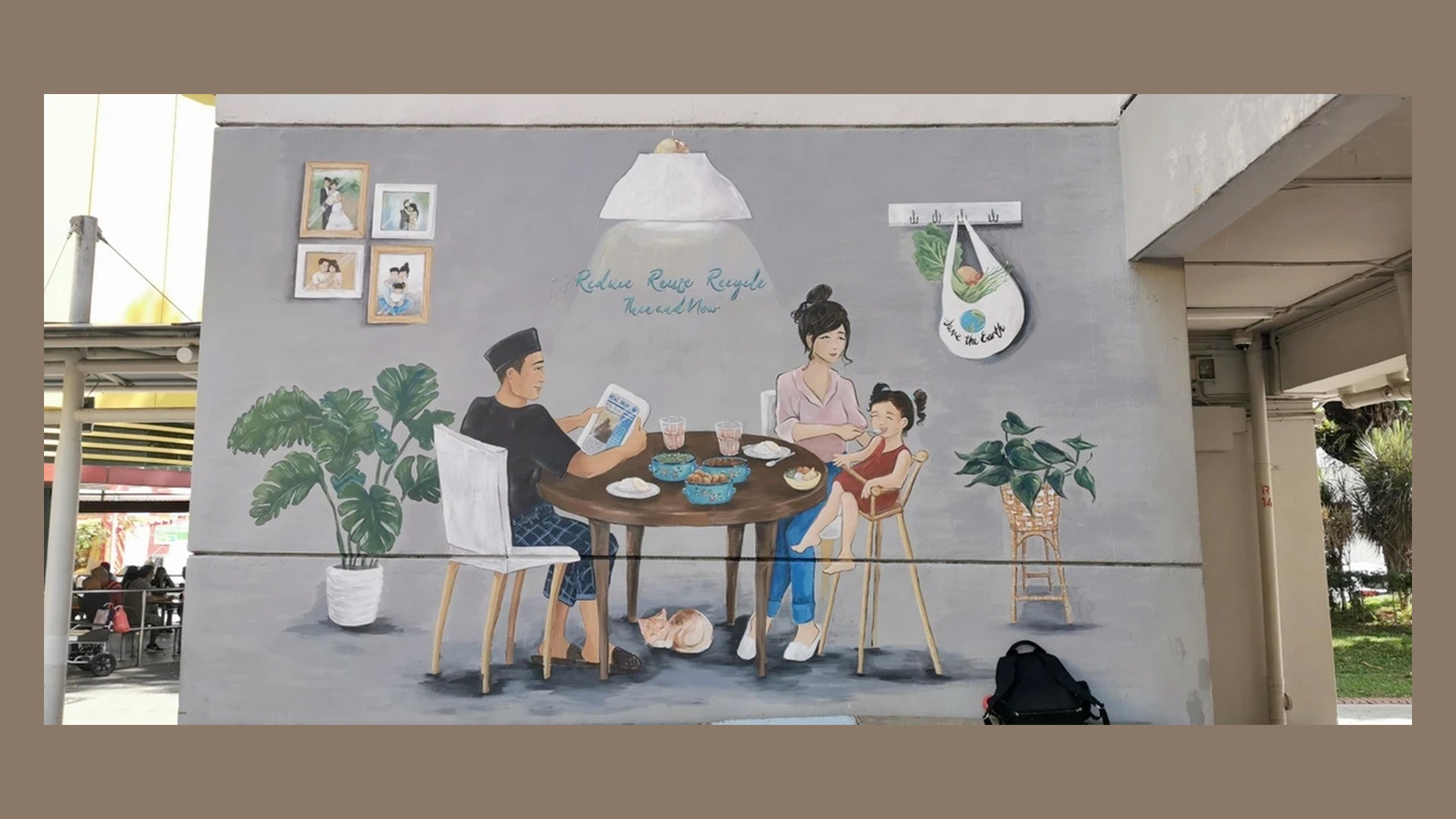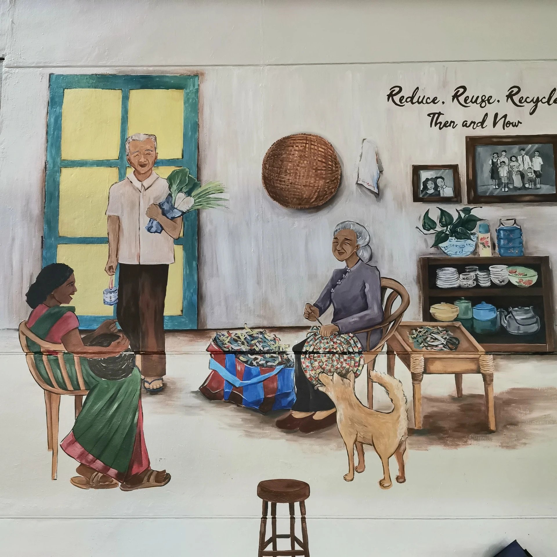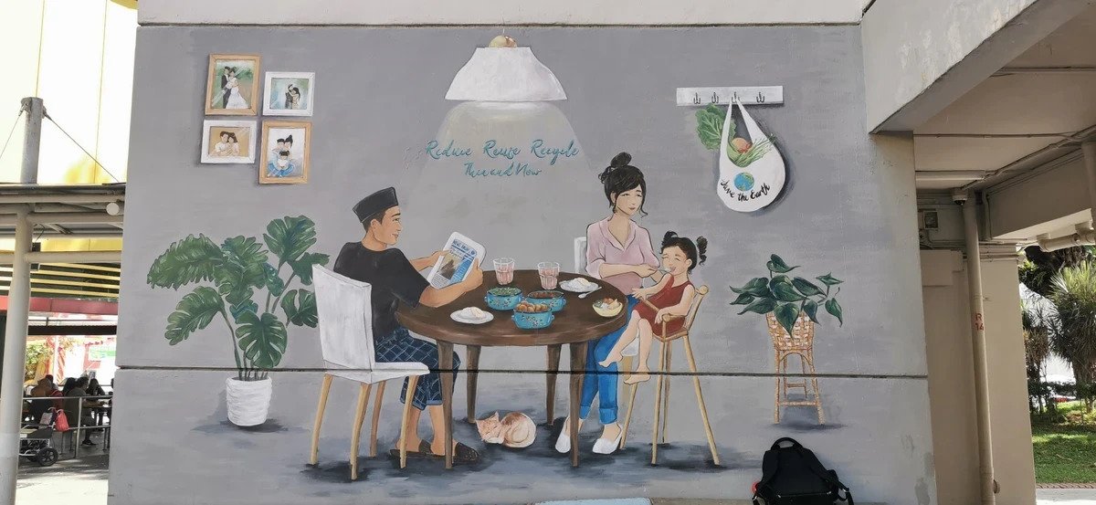 Reduce, reuse, recycle. We’ve all heard of this phrase – it’s just been made even more visually appealing in the form of a mural by local artist Biddy Low (@illgirldraws on Instagram). You can find two wall murals at Blk 528 where the Ang Mo Kio Town Council office is, depicting habits of the 3 R’s in the past and present.