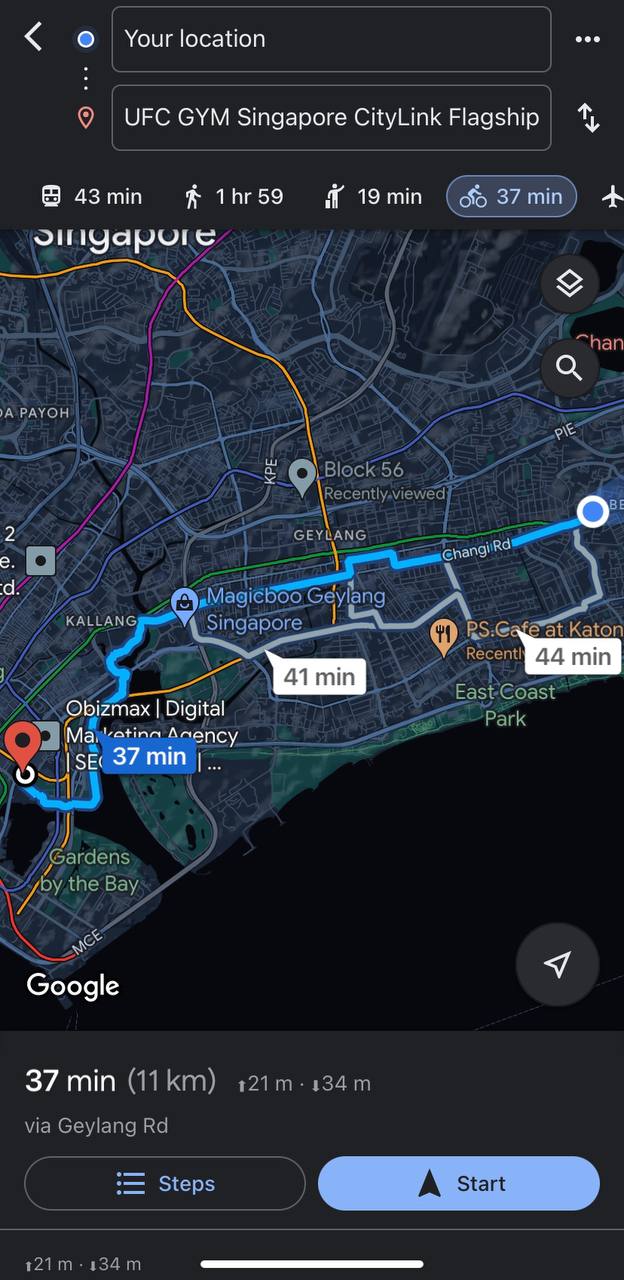 My initial plan was to do an early morning ride from my home in Bedok to the UFC Gym in City Hall where I usually work out. Yes, I was going to cycle 13km back and forth with a gym session sandwhiched in between. #Fitspo or #bodoh, you decide. But alas, the weather wasn't co-operating as it started to pour as soon as I woke up. So it became a mid-day session instead.