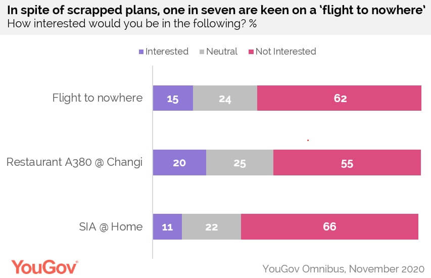 While SIA's plans for flights to nowhere were permanently, ahem, grounded by criticism about the proposed flights' environmental impact, one in seven (15%) survey respondents indicated that they'd still be interested in boarding a flight to nowhere.