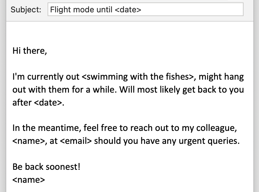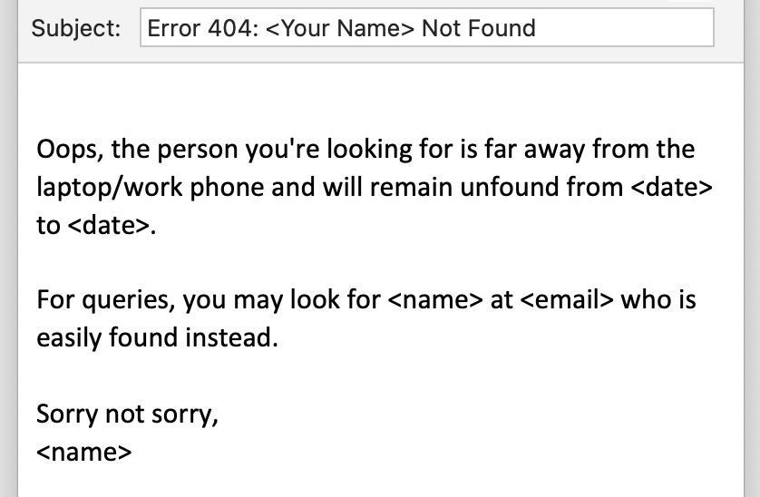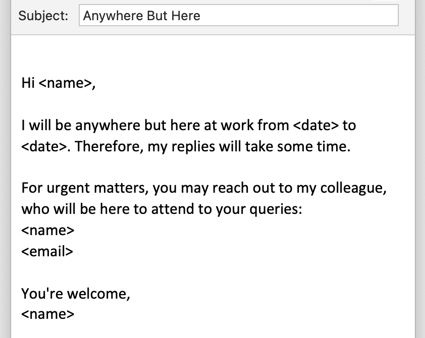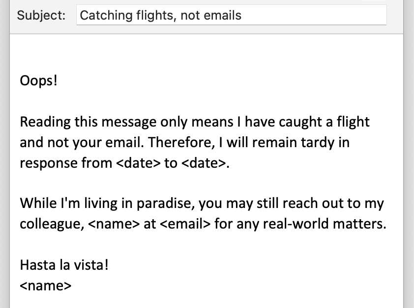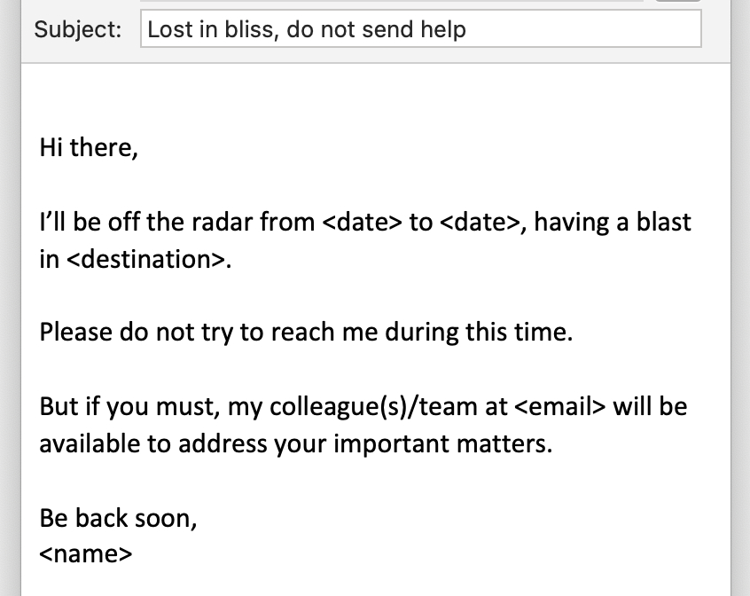If you have grand plans for a vacation, this email is your bragging right. Flaunt your itinerary with style but don’t forget to direct queries to your coworkers.