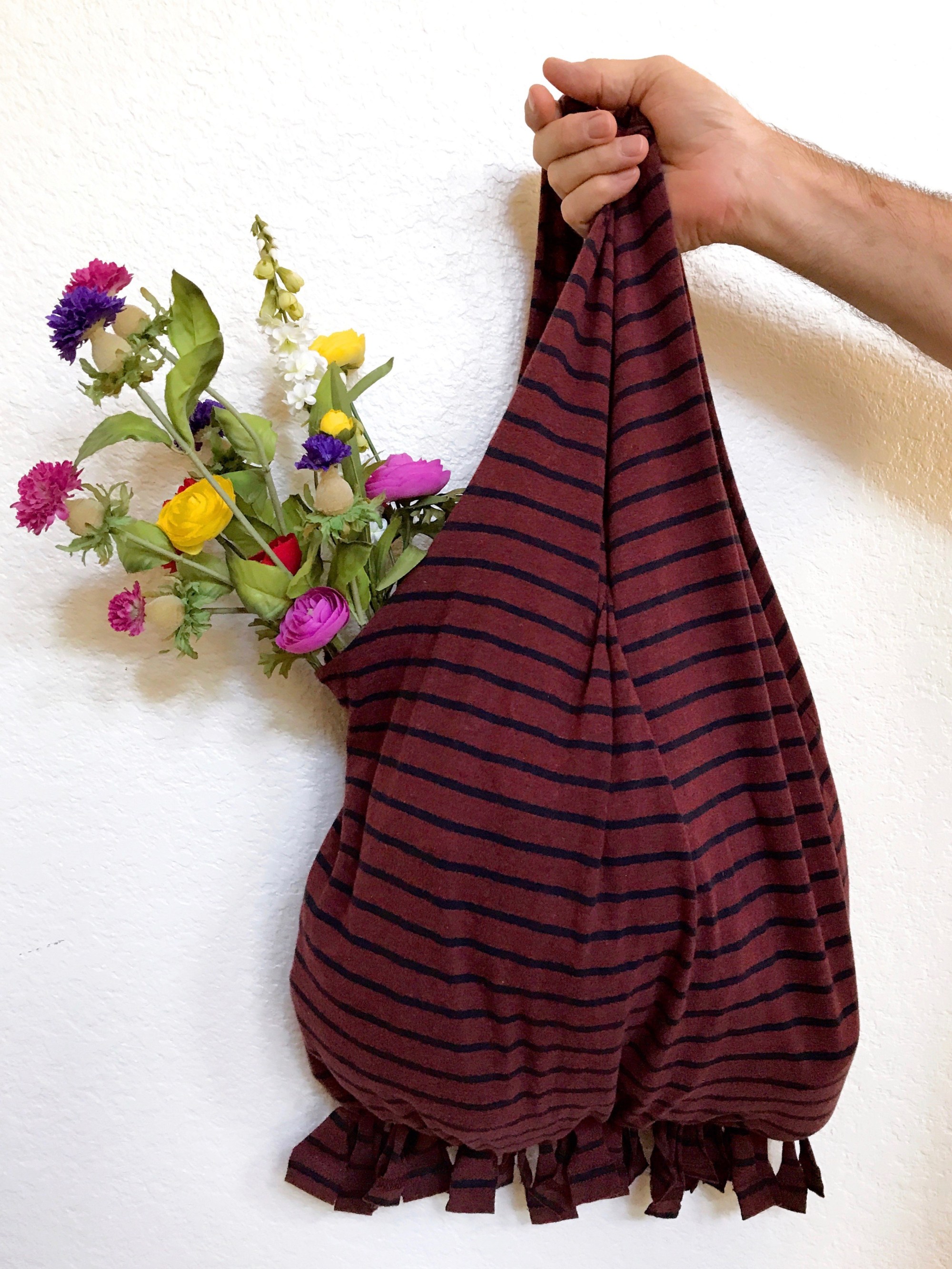 Plastic bags are out the window. One of the most basic upcycling activities is to make a shopping bag from an old, favourite t-shirt. Simply stitch along the bottom of the shirt to hold it together, cut off the arms and neck and you have a bag with handles. Bye-bye plastic bags.